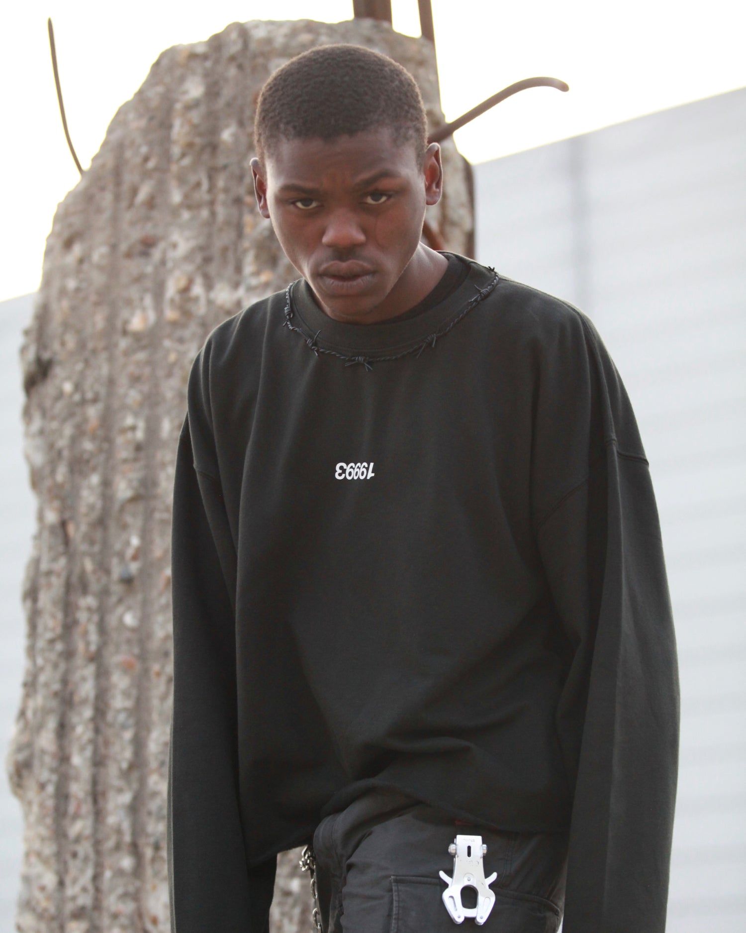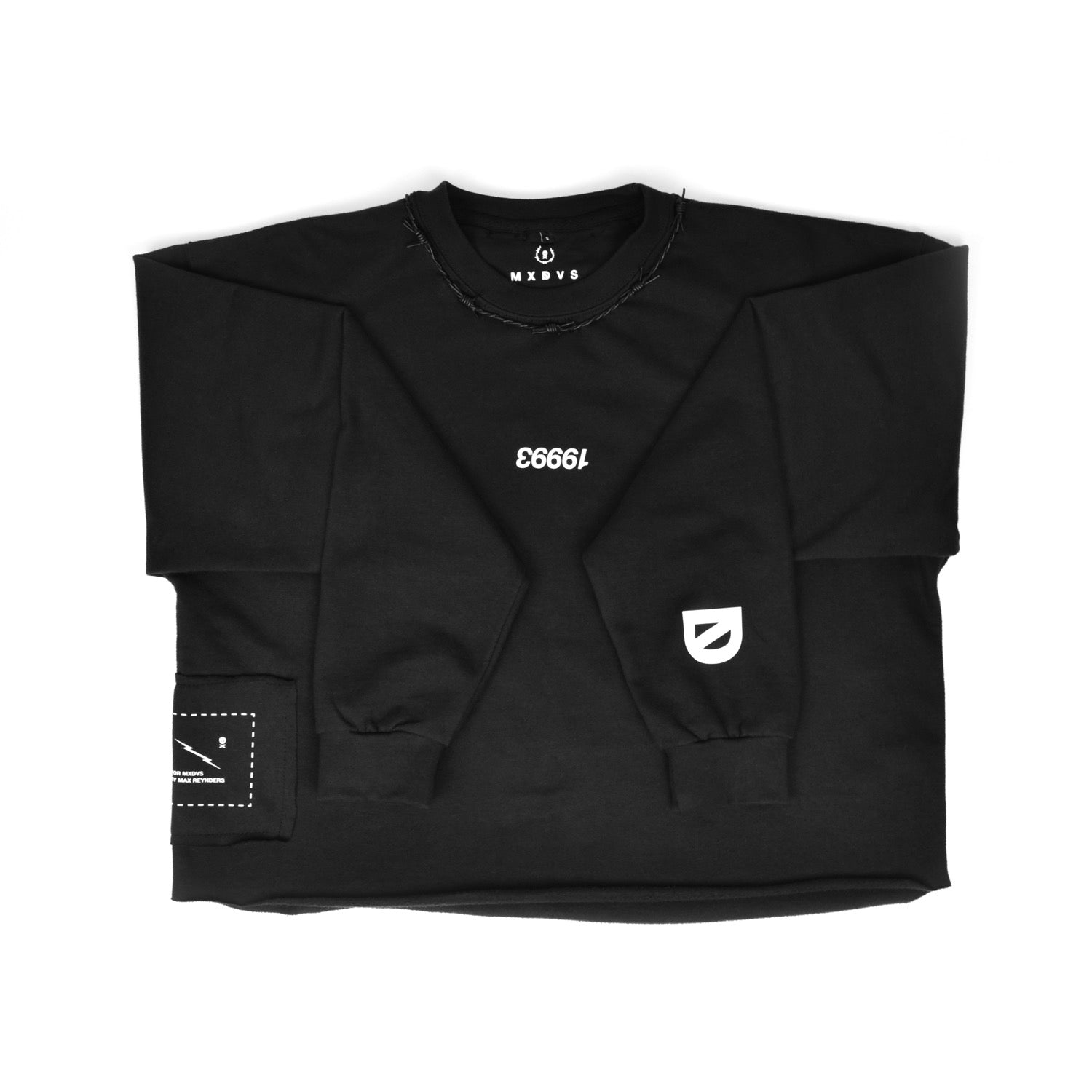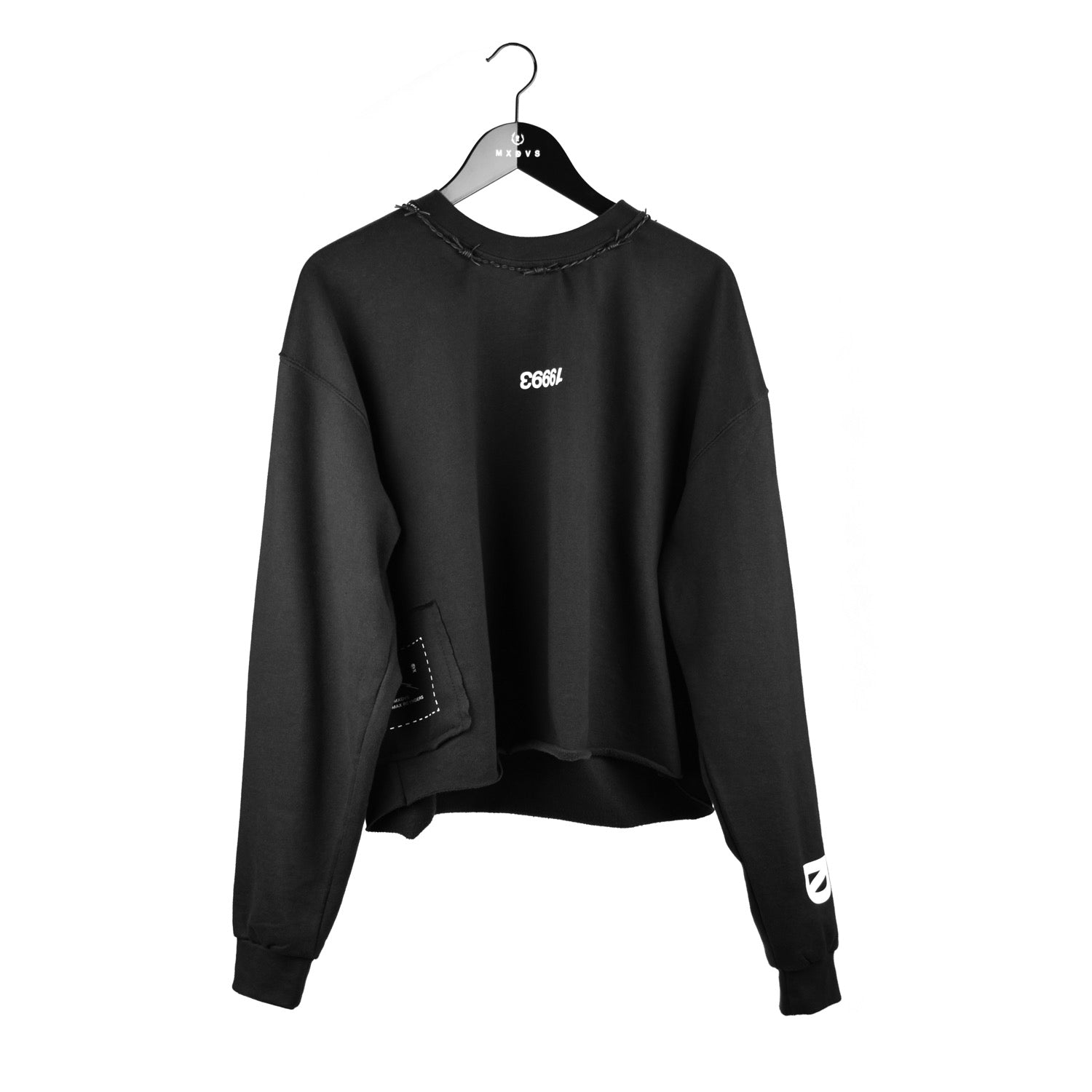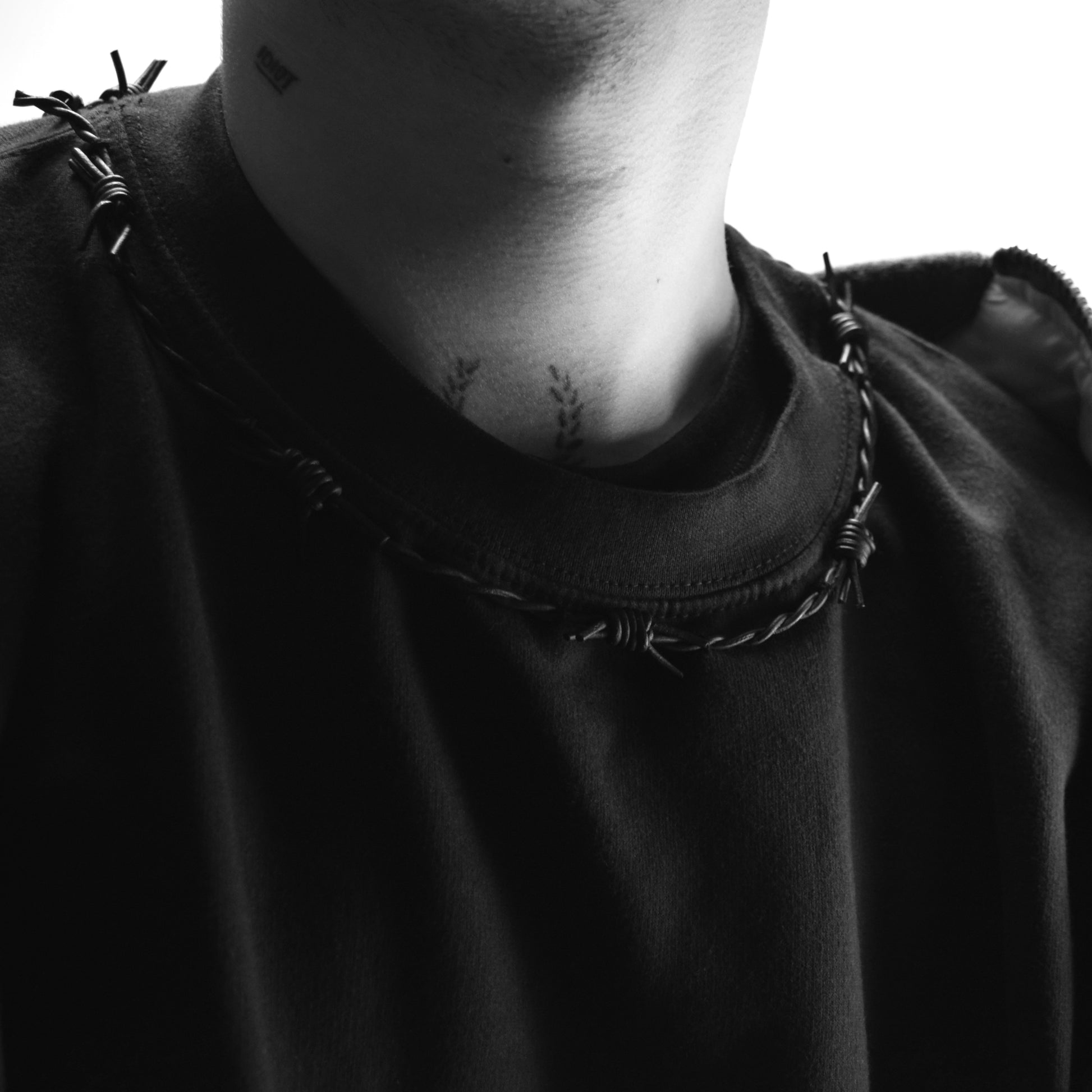Oversized Cropped Crewneck with leather barbed wire hand stitched around the collar