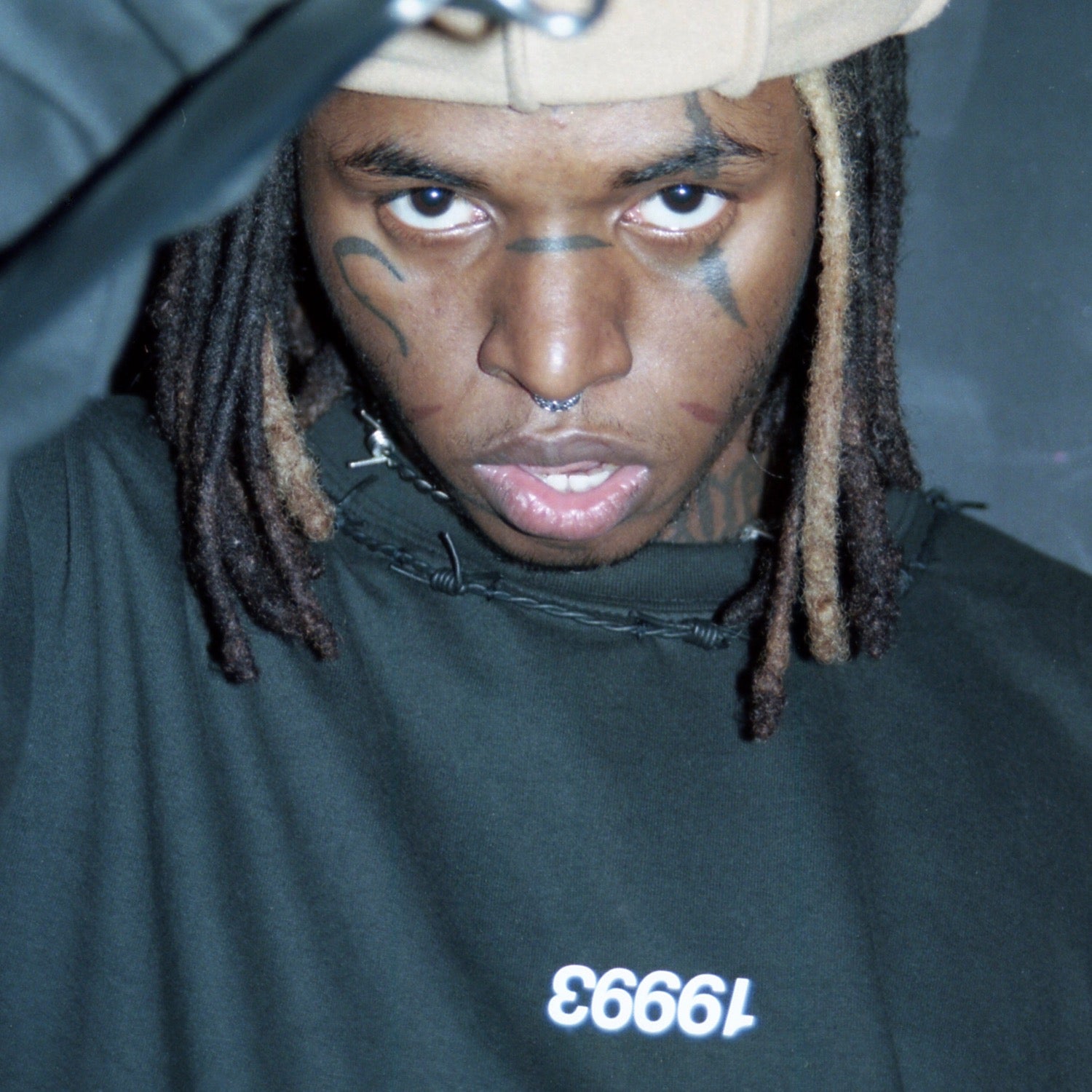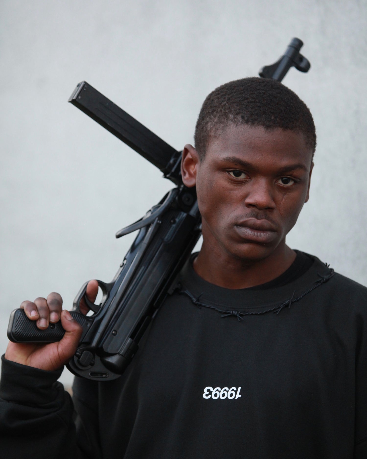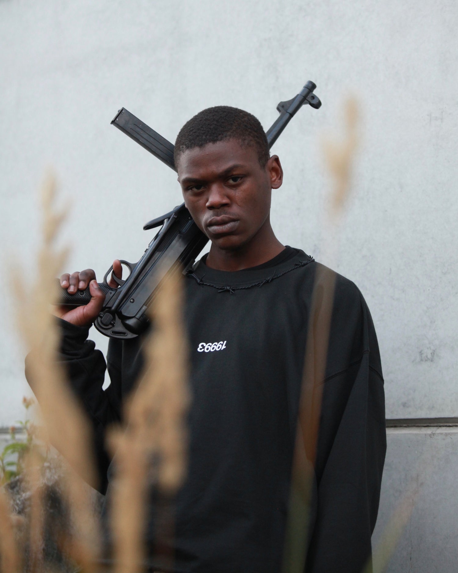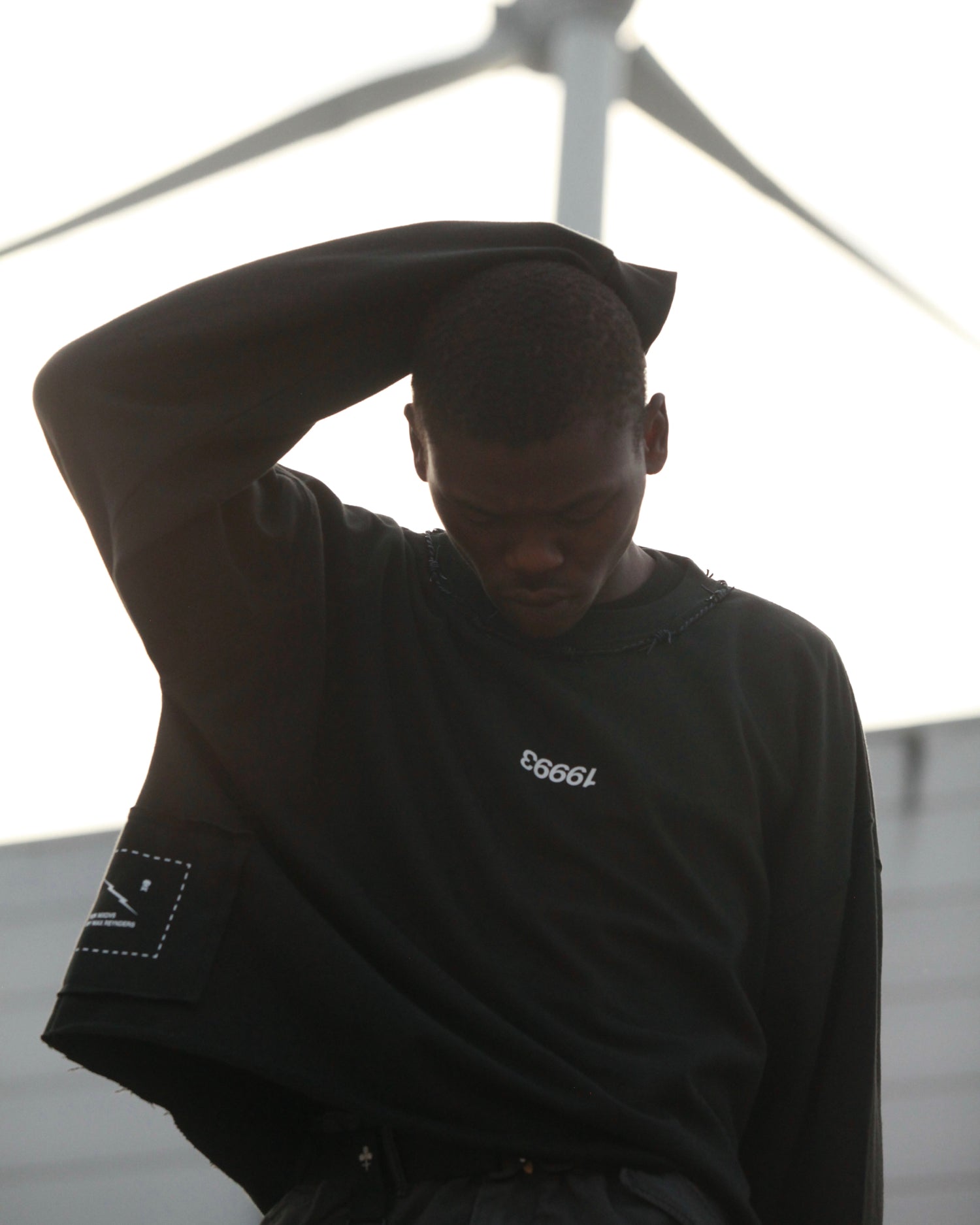 Oversized Cropped Crewneck with leather barbed wire hand stitched around the collar
