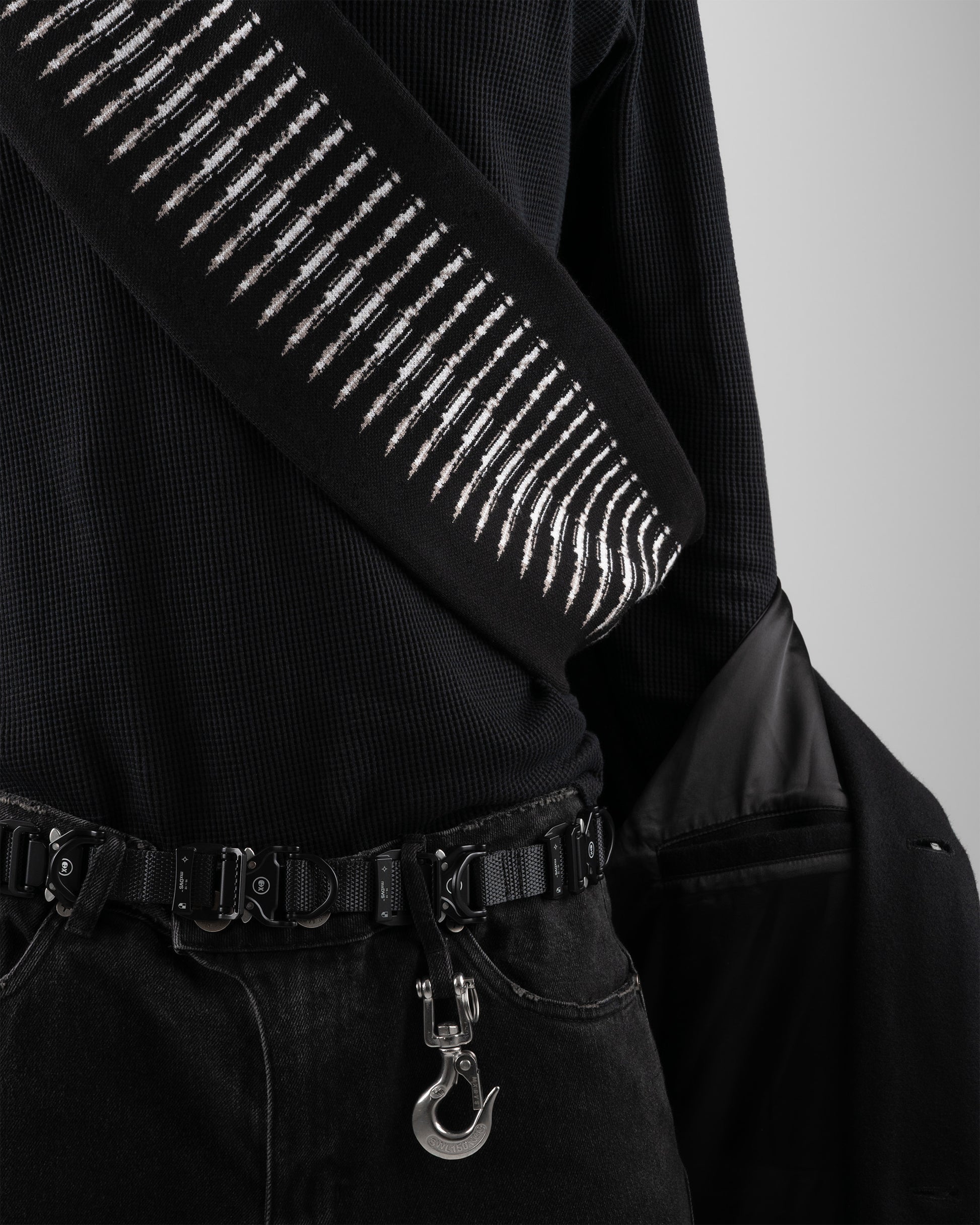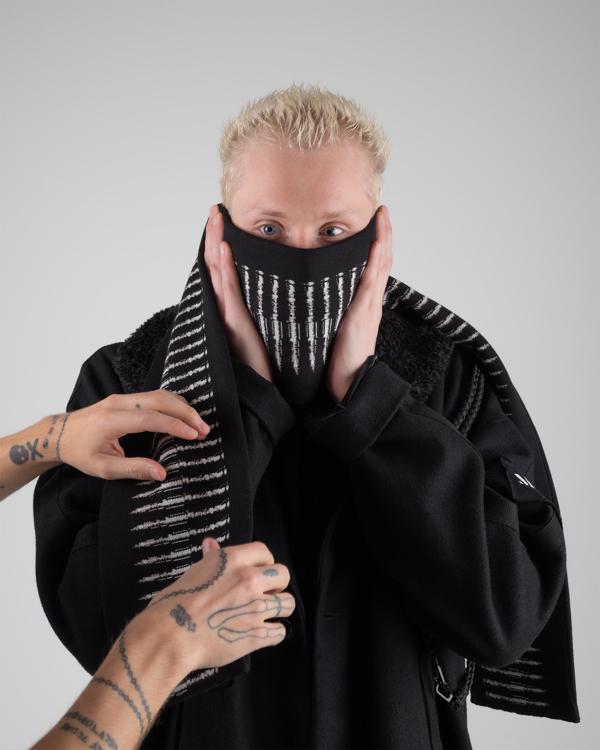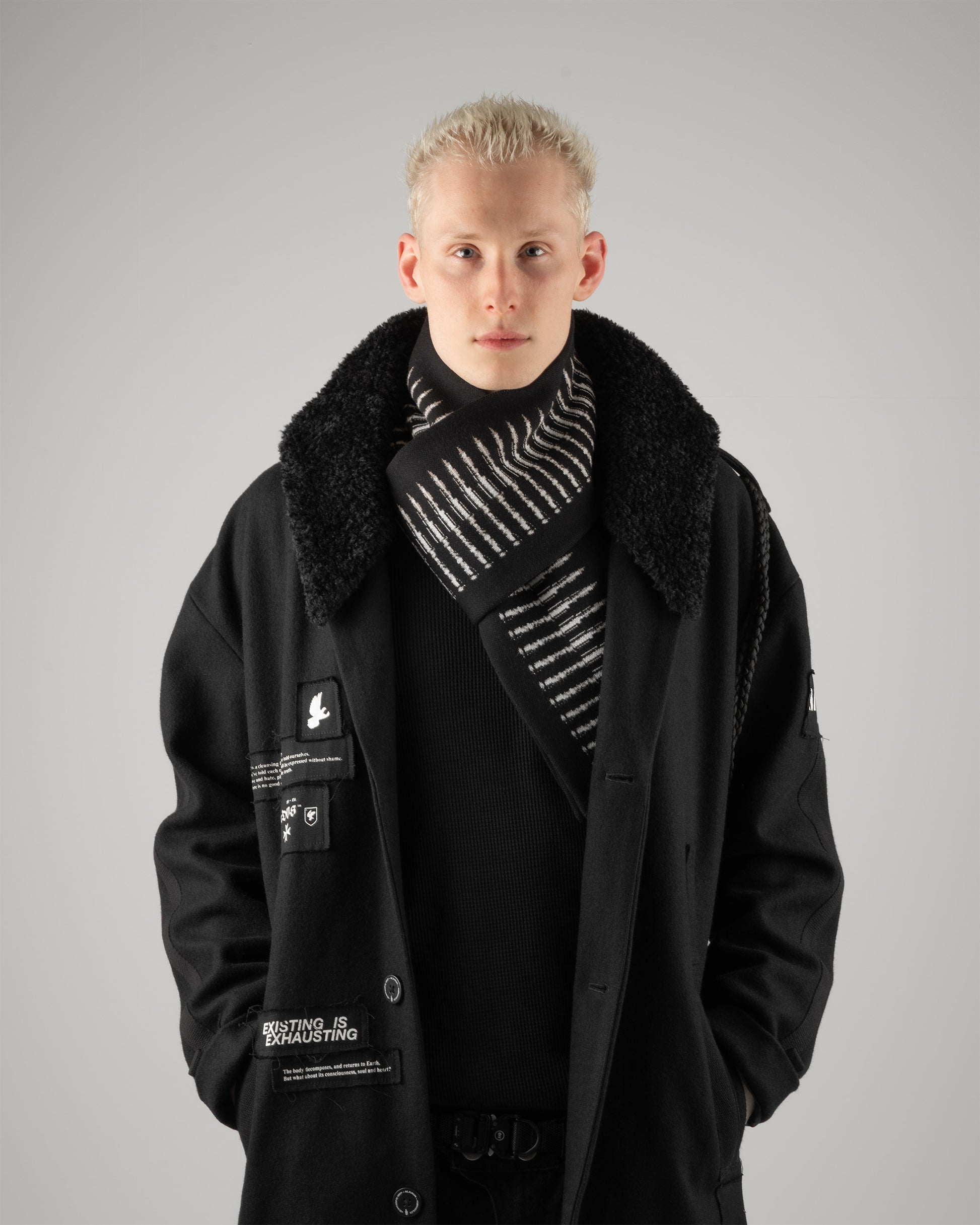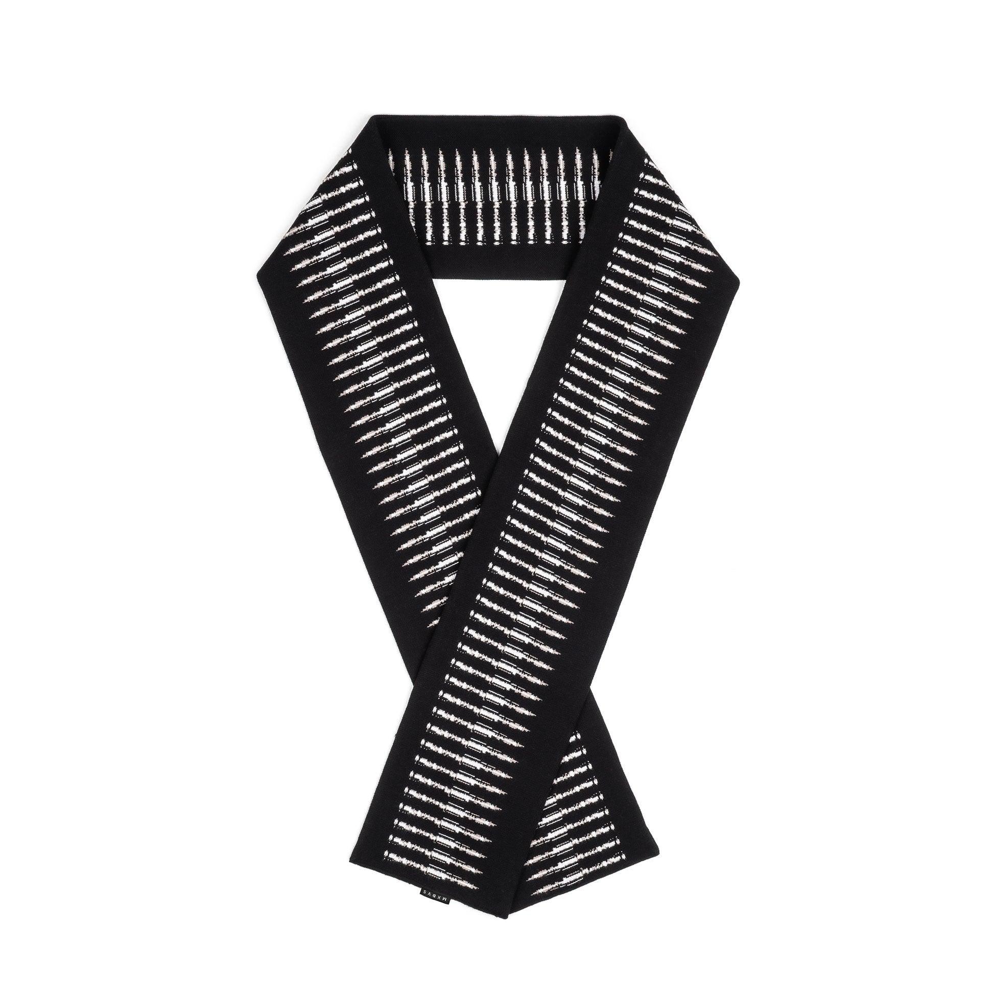 Soft jacquard scarf with a bullet belt graphic. Inspired by the Department of War, we would like to return to the Department of Defense. Keeping your essential body parts protected in globally uncertain times.