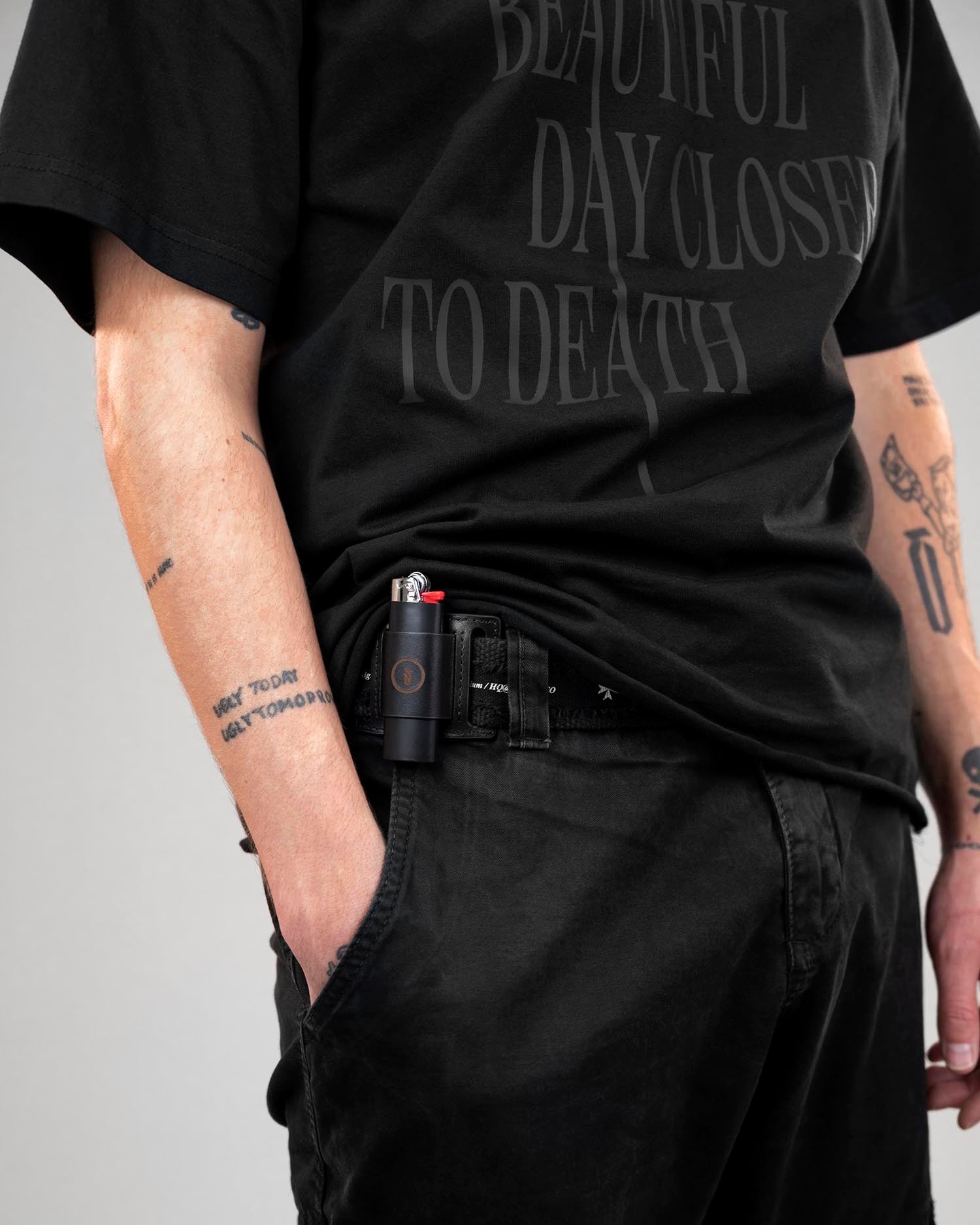 Disclaimer 1: Due to the size of the magnetic buckles used on our Belt 2.1 and belt 3.0, this lighter holder will not fit on them. It will fit on our canvas belt or any other common belt.