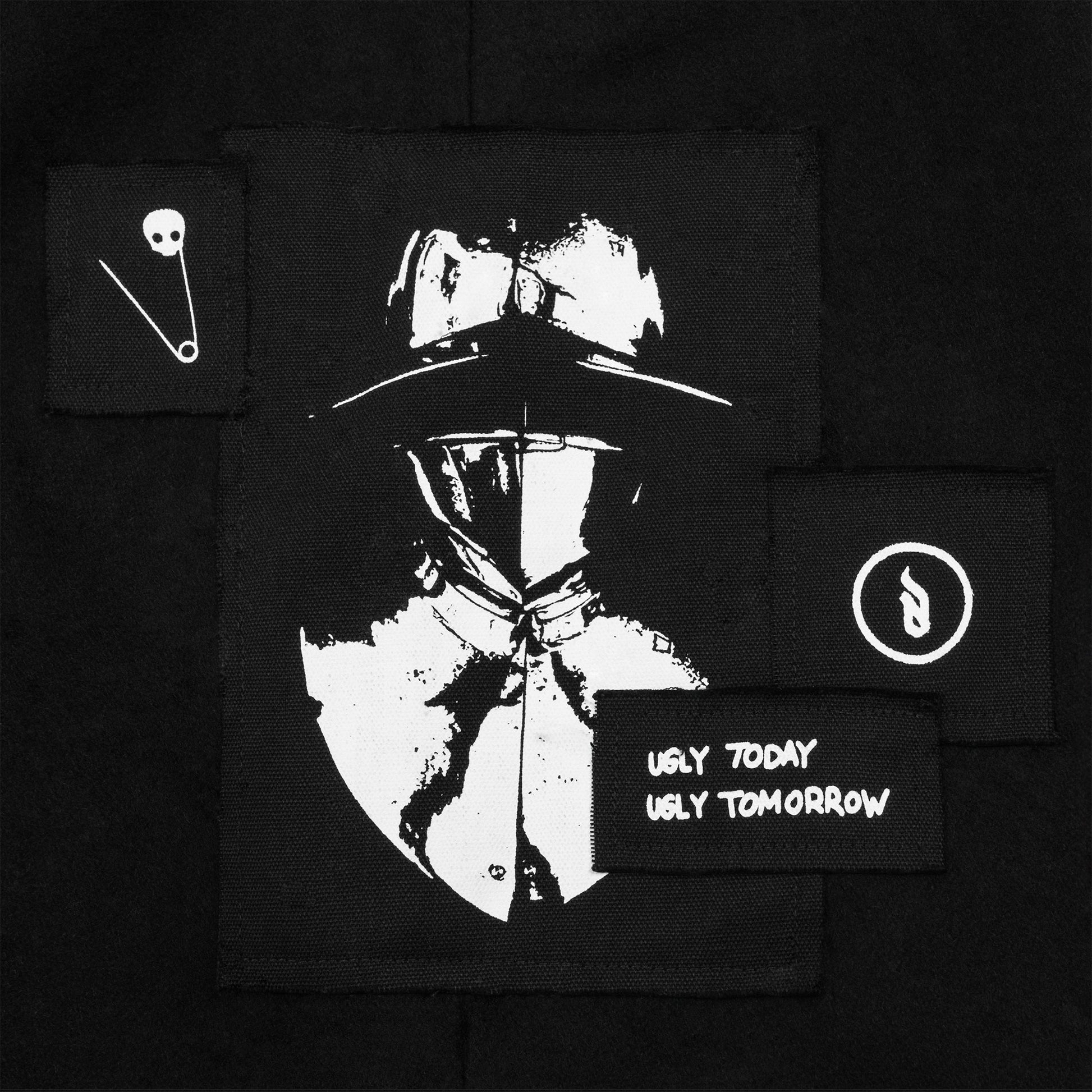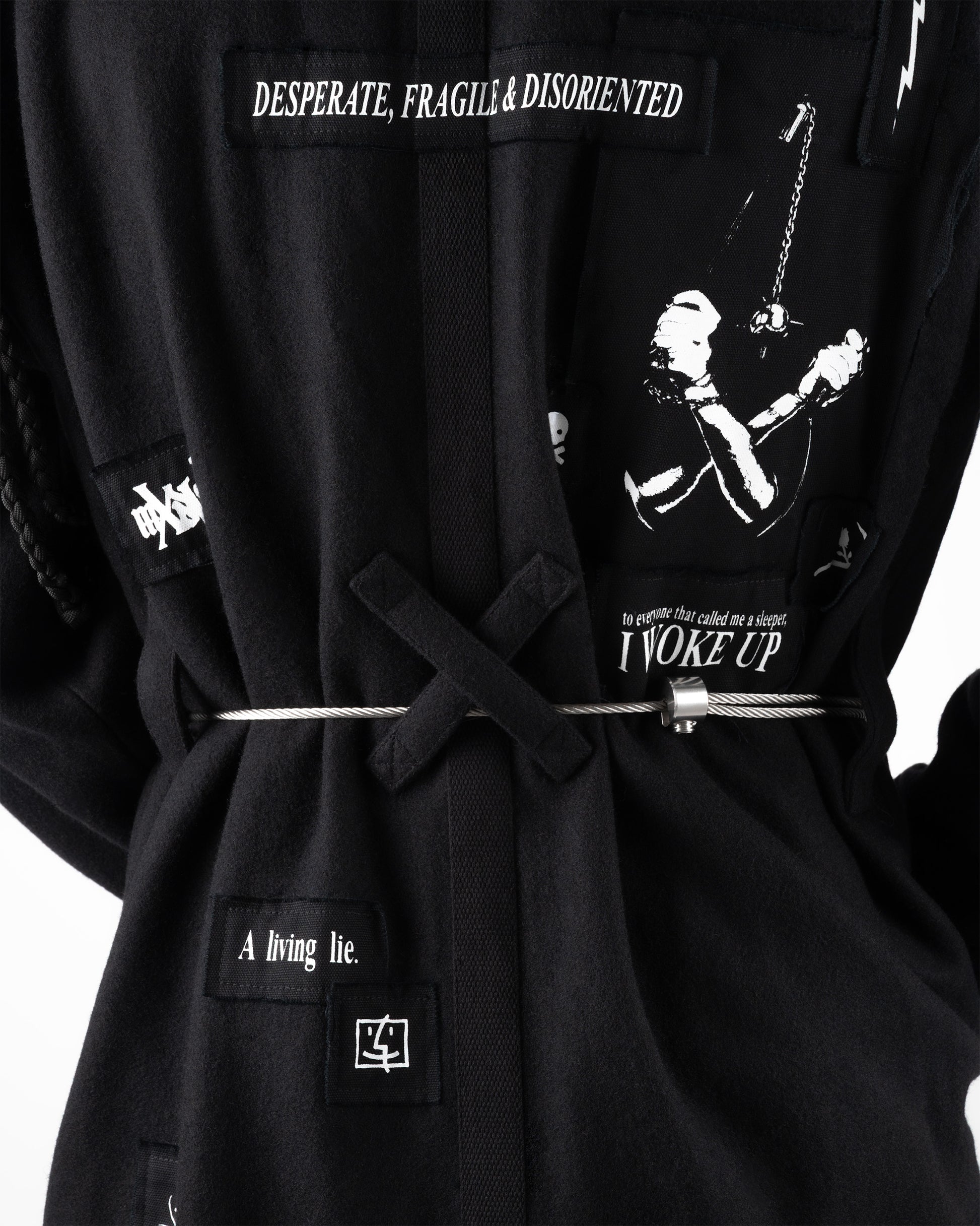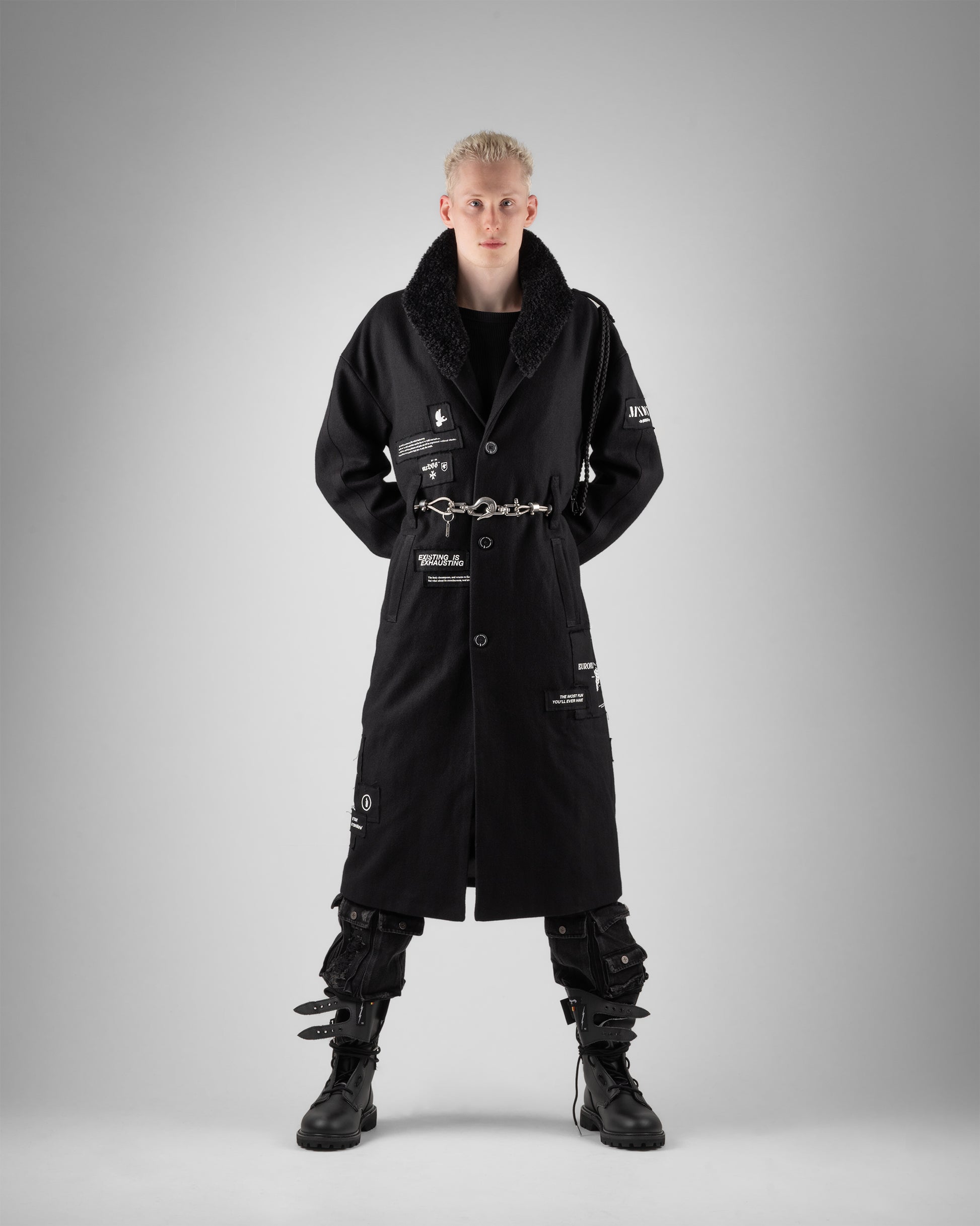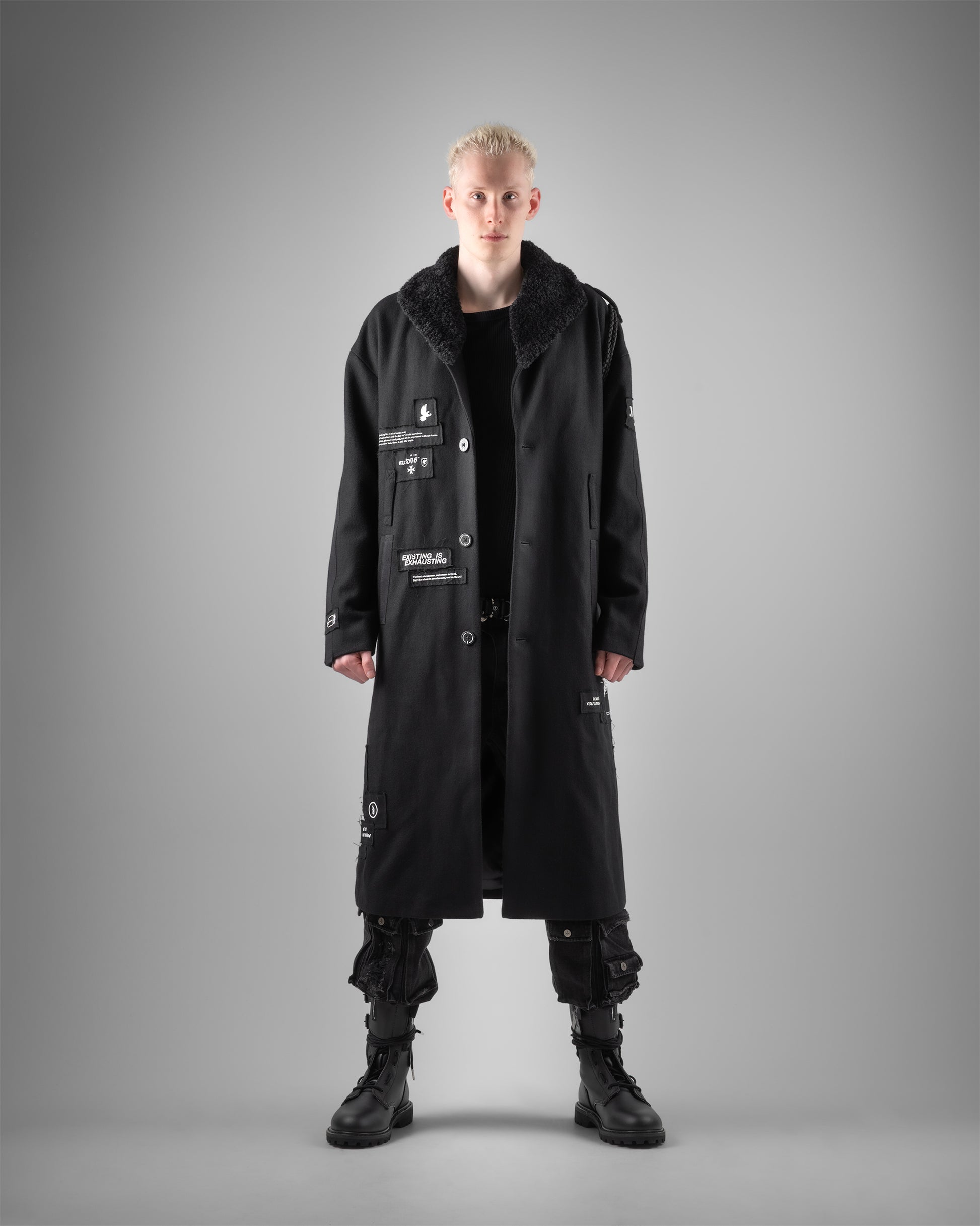 Oversized long coat with the commanding presence of a streetwise captain, covered in 25 screenprinted patches. It has pockets for essentials and details that hint at blue-collar readiness and military precision without taking itself too seriously.