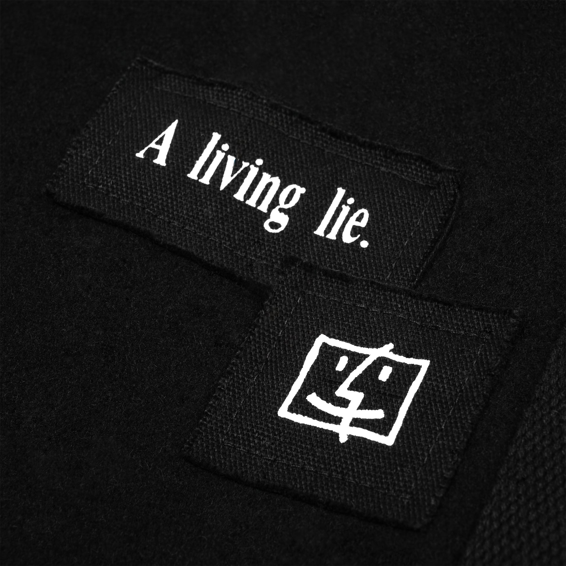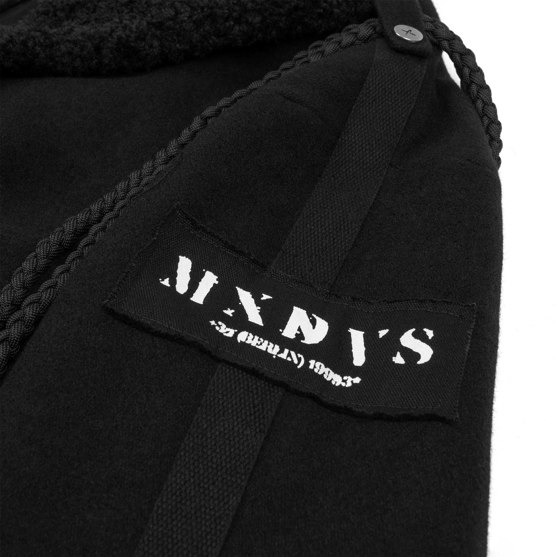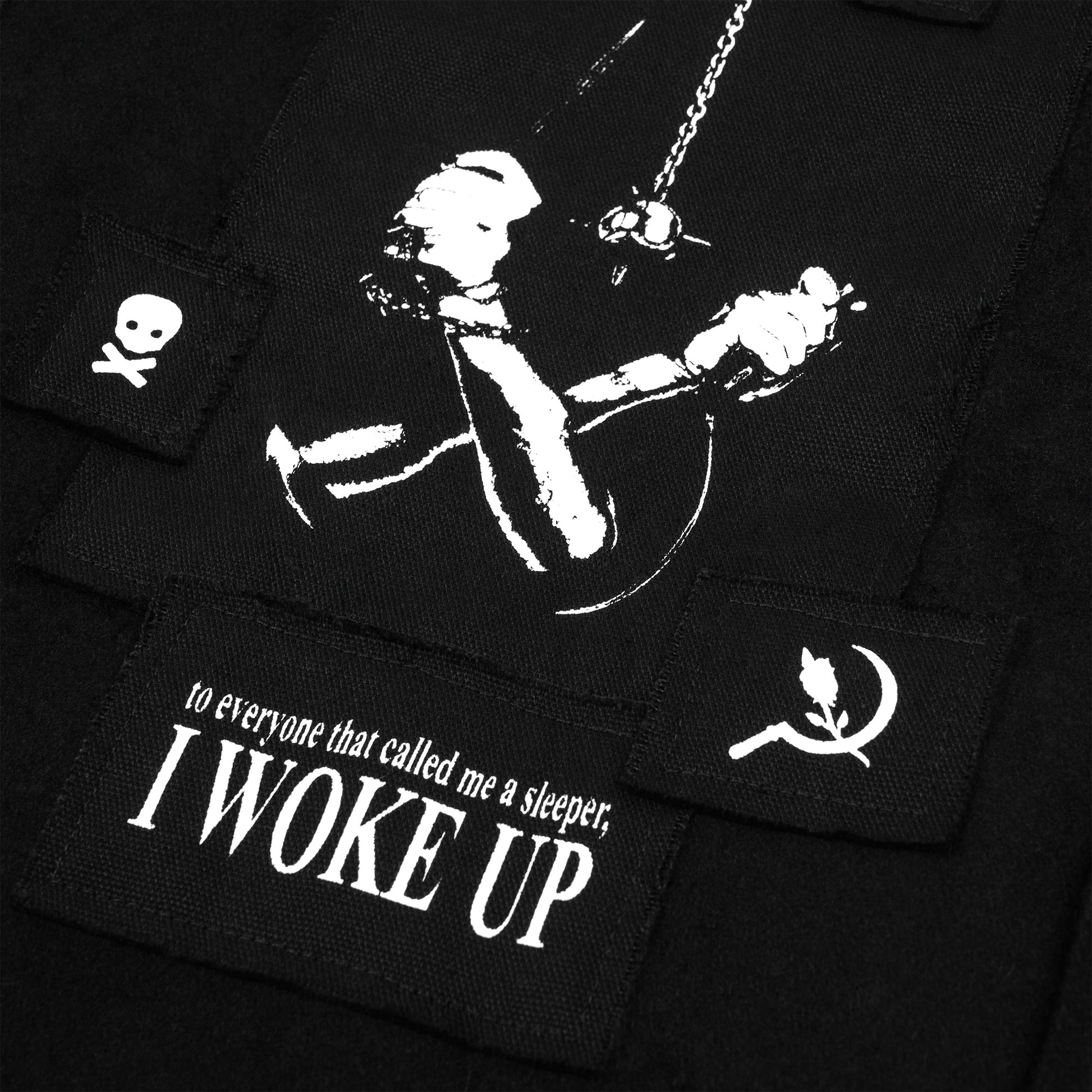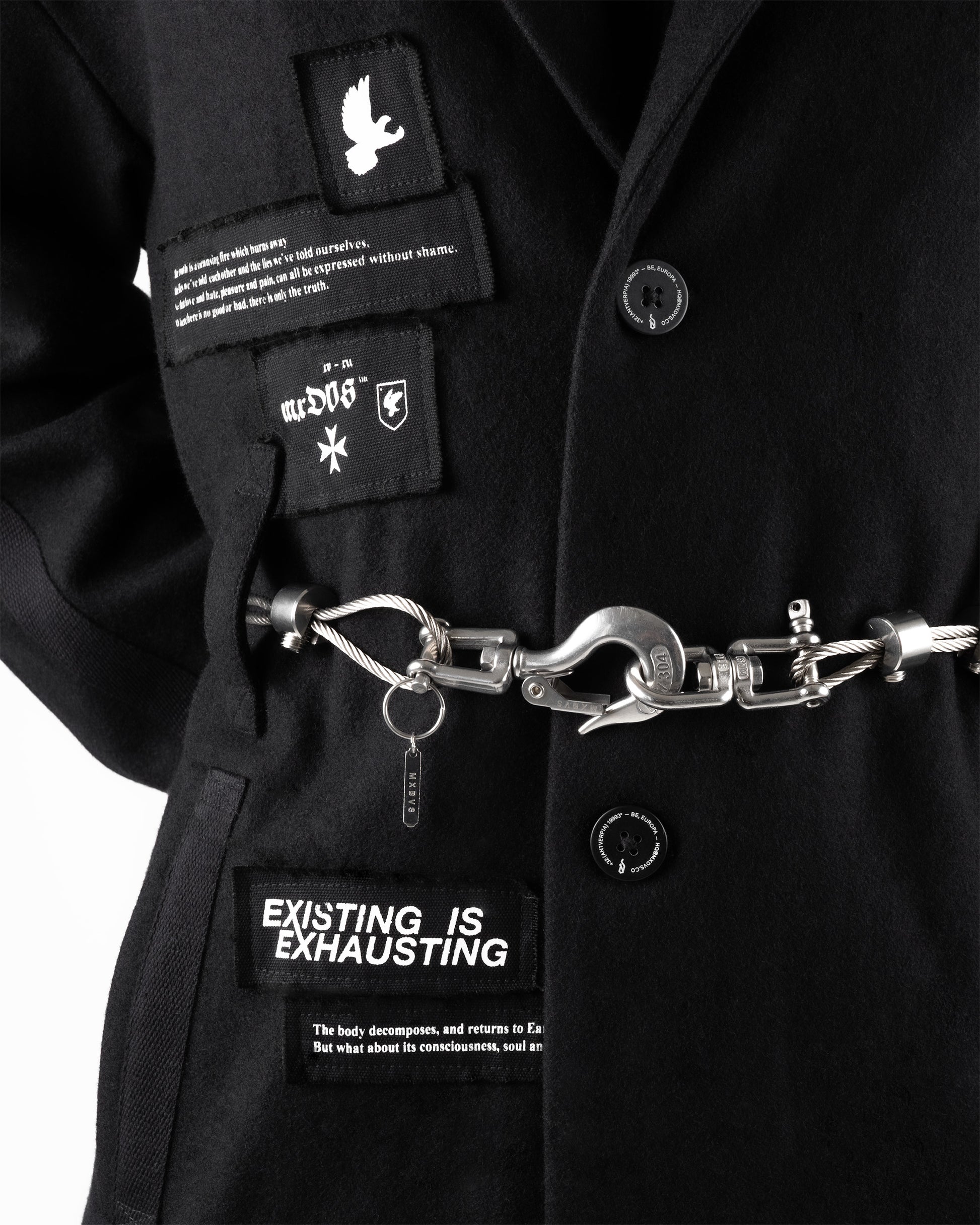 Oversized long coat with the commanding presence of a streetwise captain, covered in 25 screenprinted patches. It has pockets for essentials and details that hint at blue-collar readiness and military precision without taking itself too seriously.