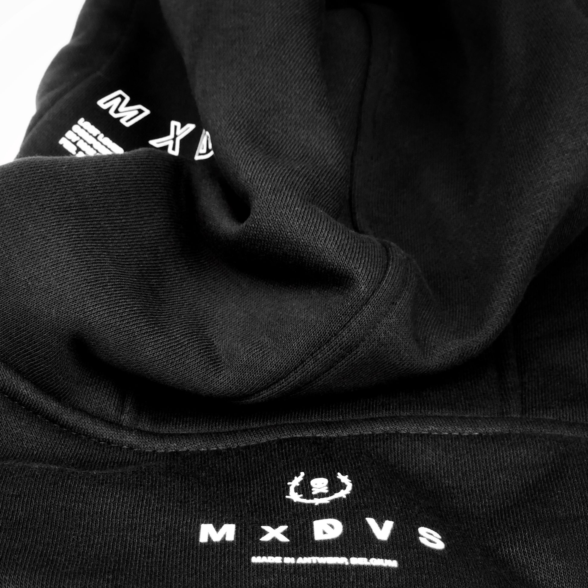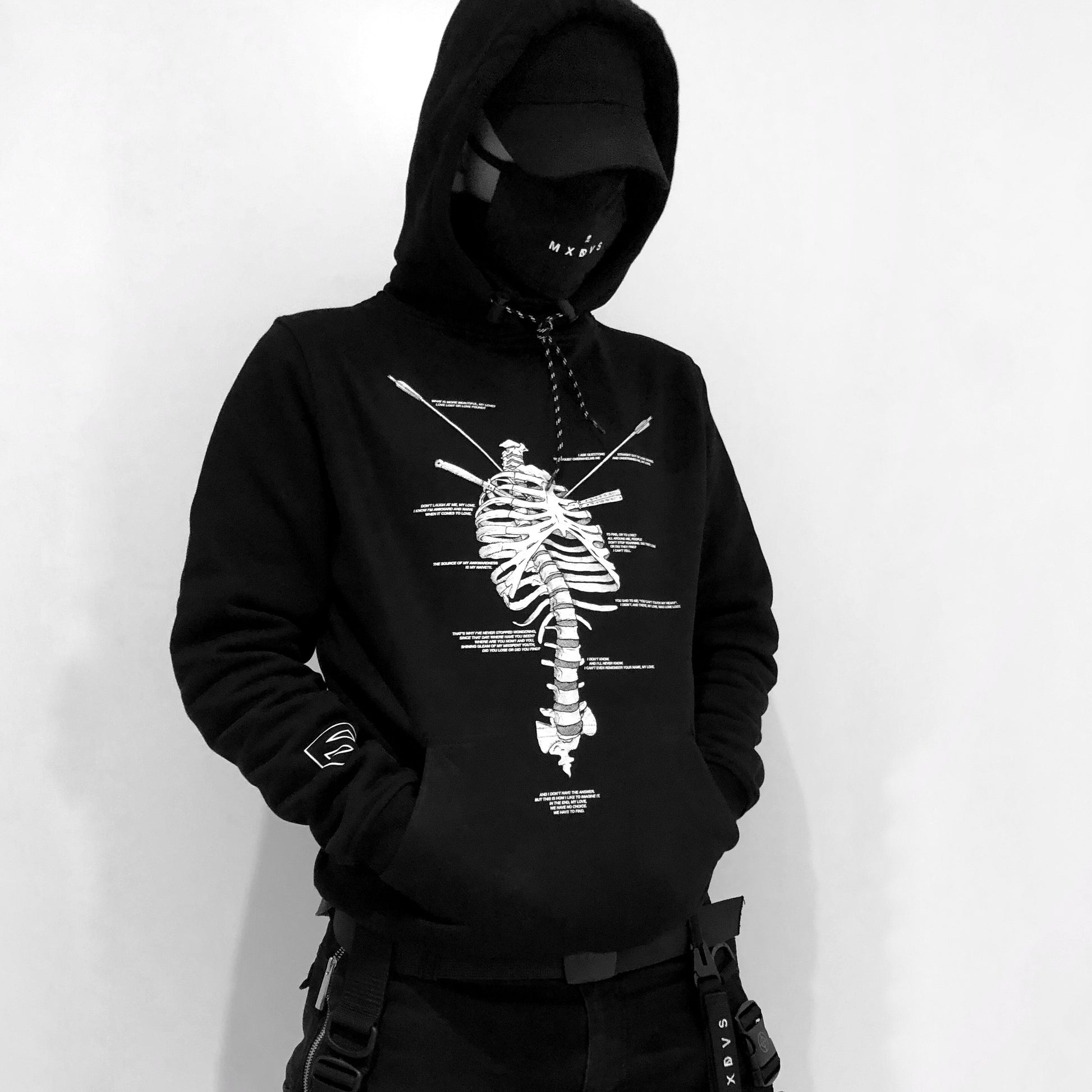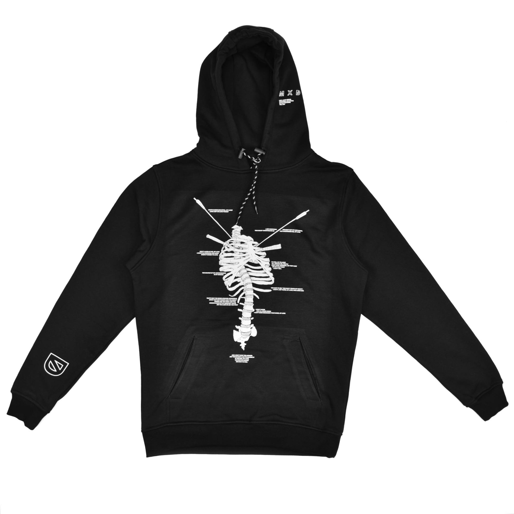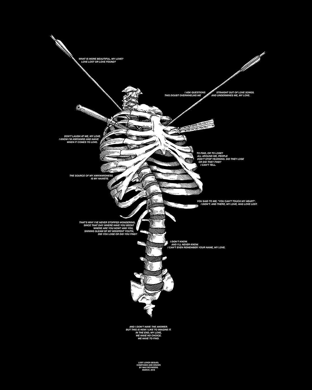 Cross hatching of a ribcage with arrows and the same knives from the Lost Lover 1 hoodie, all pointed to the heart.