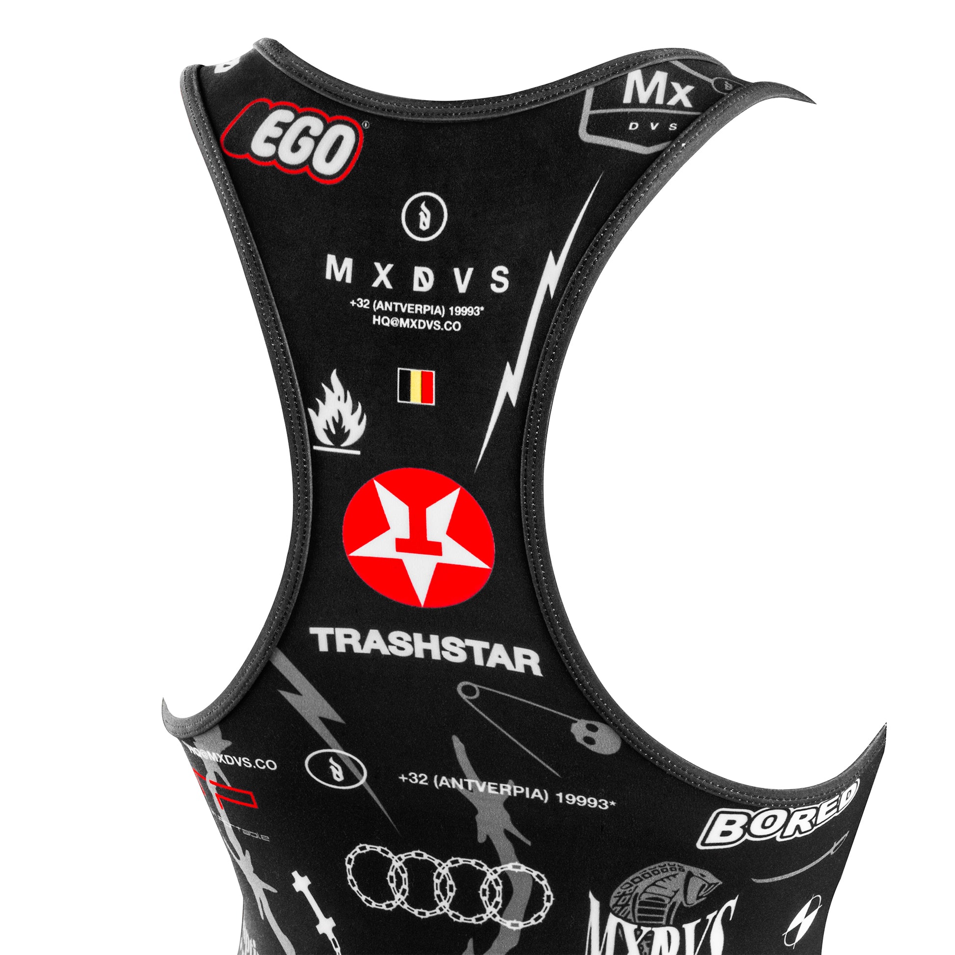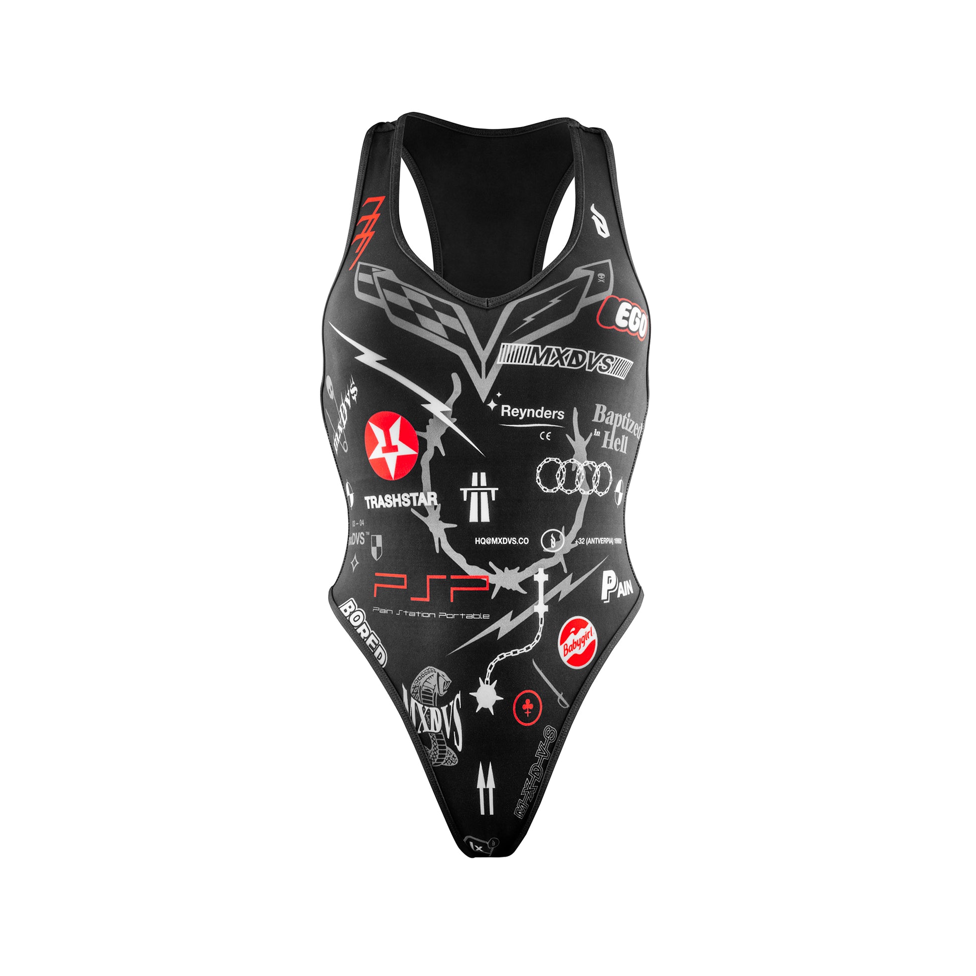 Experience the thrill of the race with these swimsuit featuring 32 intricately printed bootleg logos, as seen on our Trashstar Racing Suit.