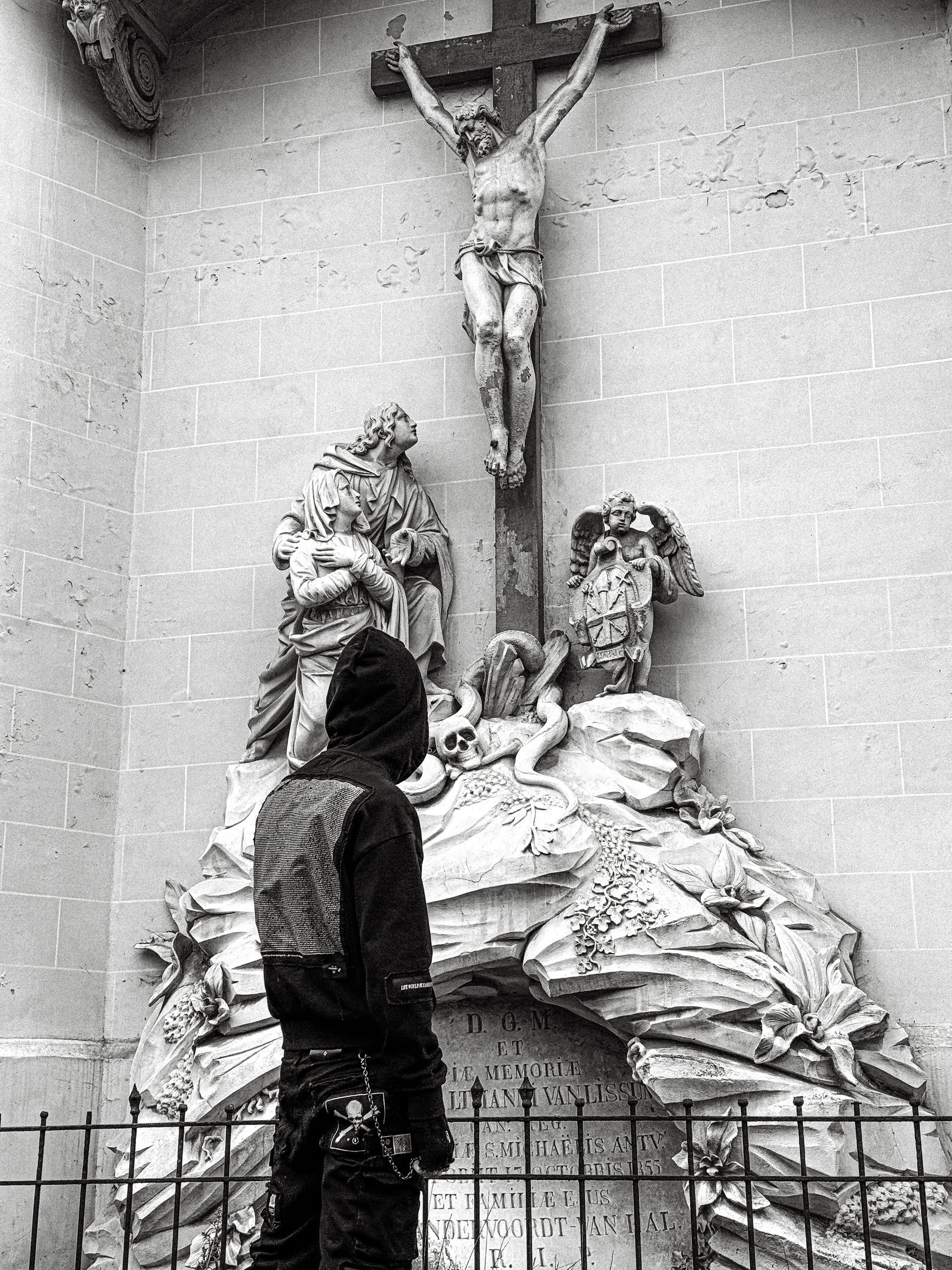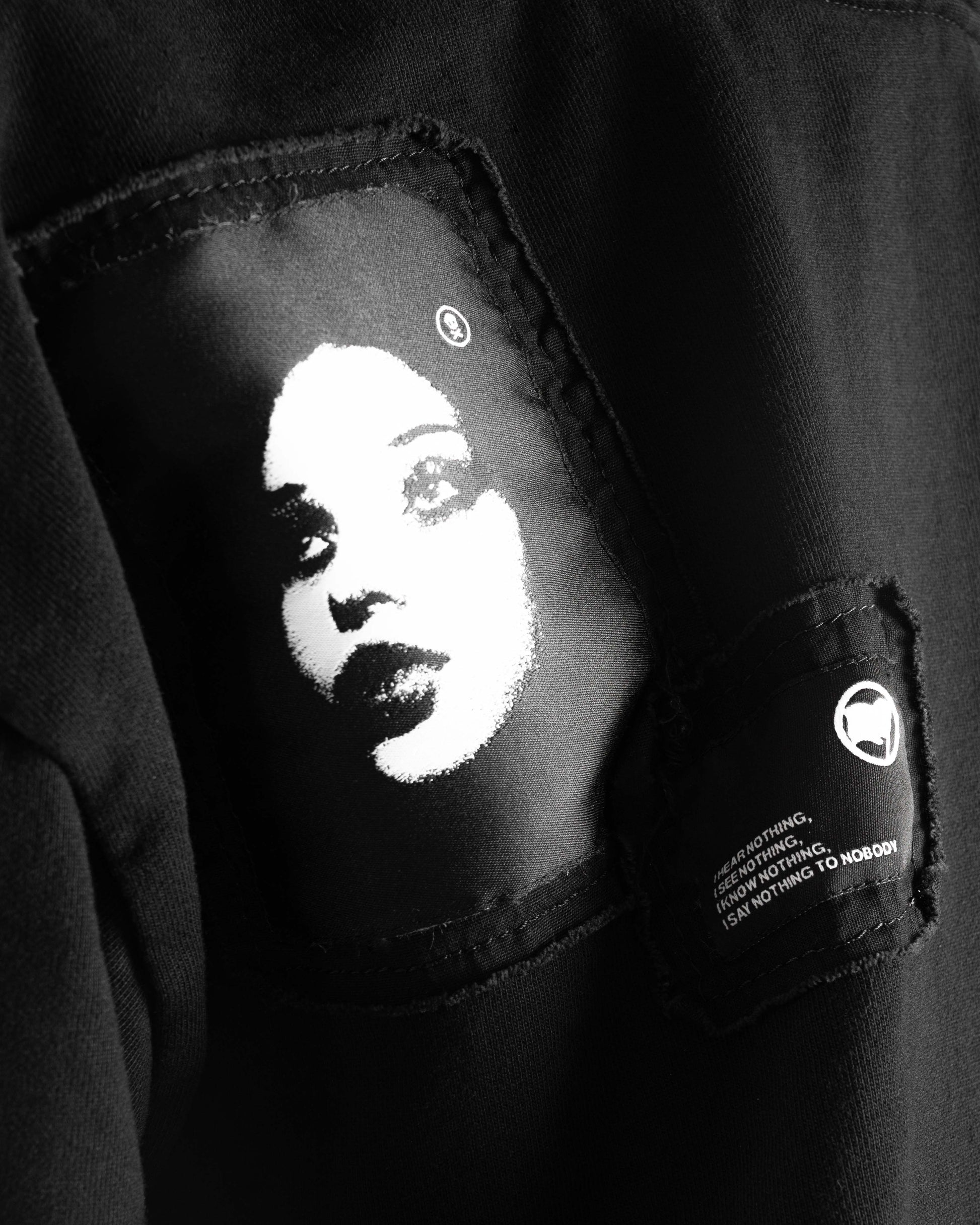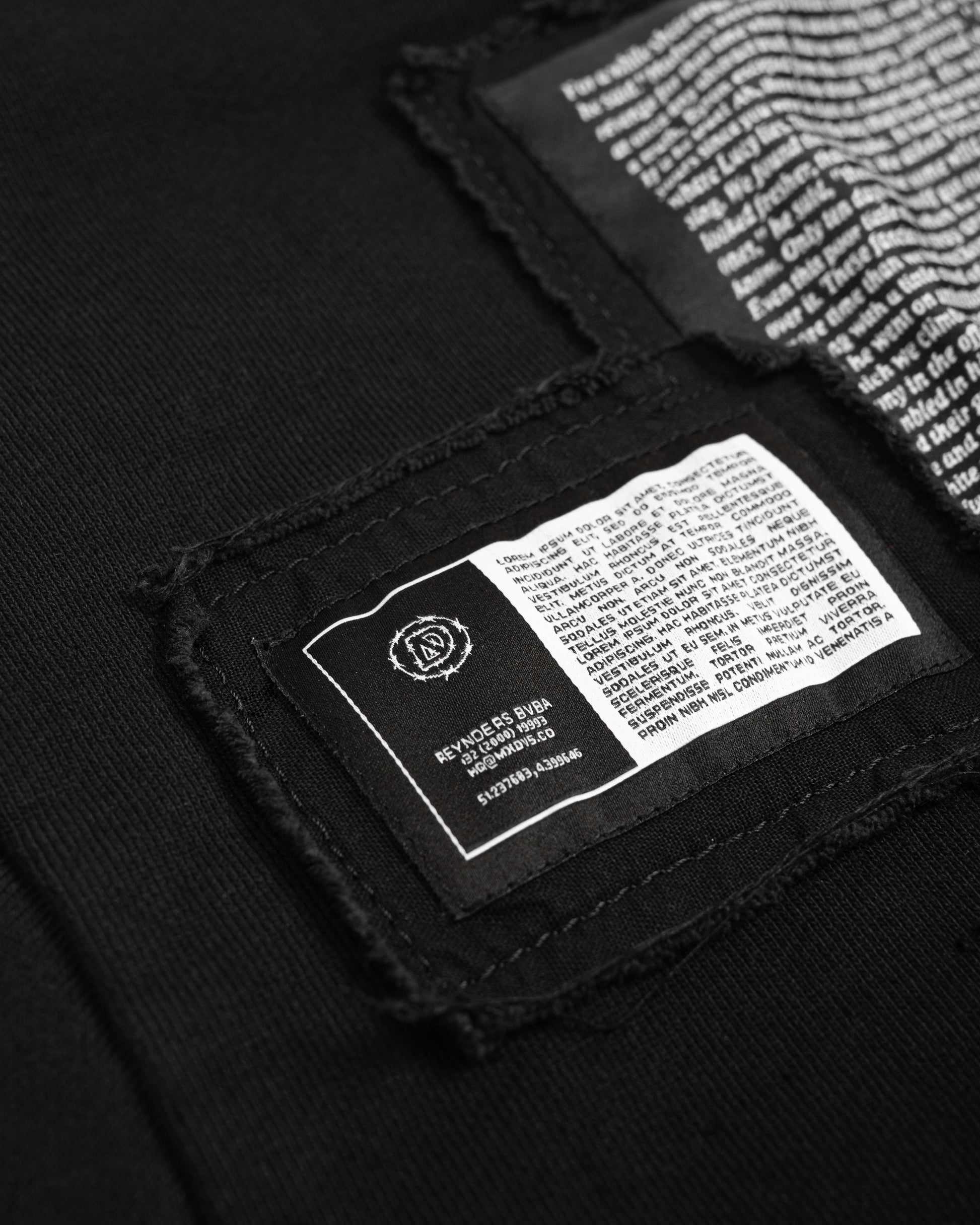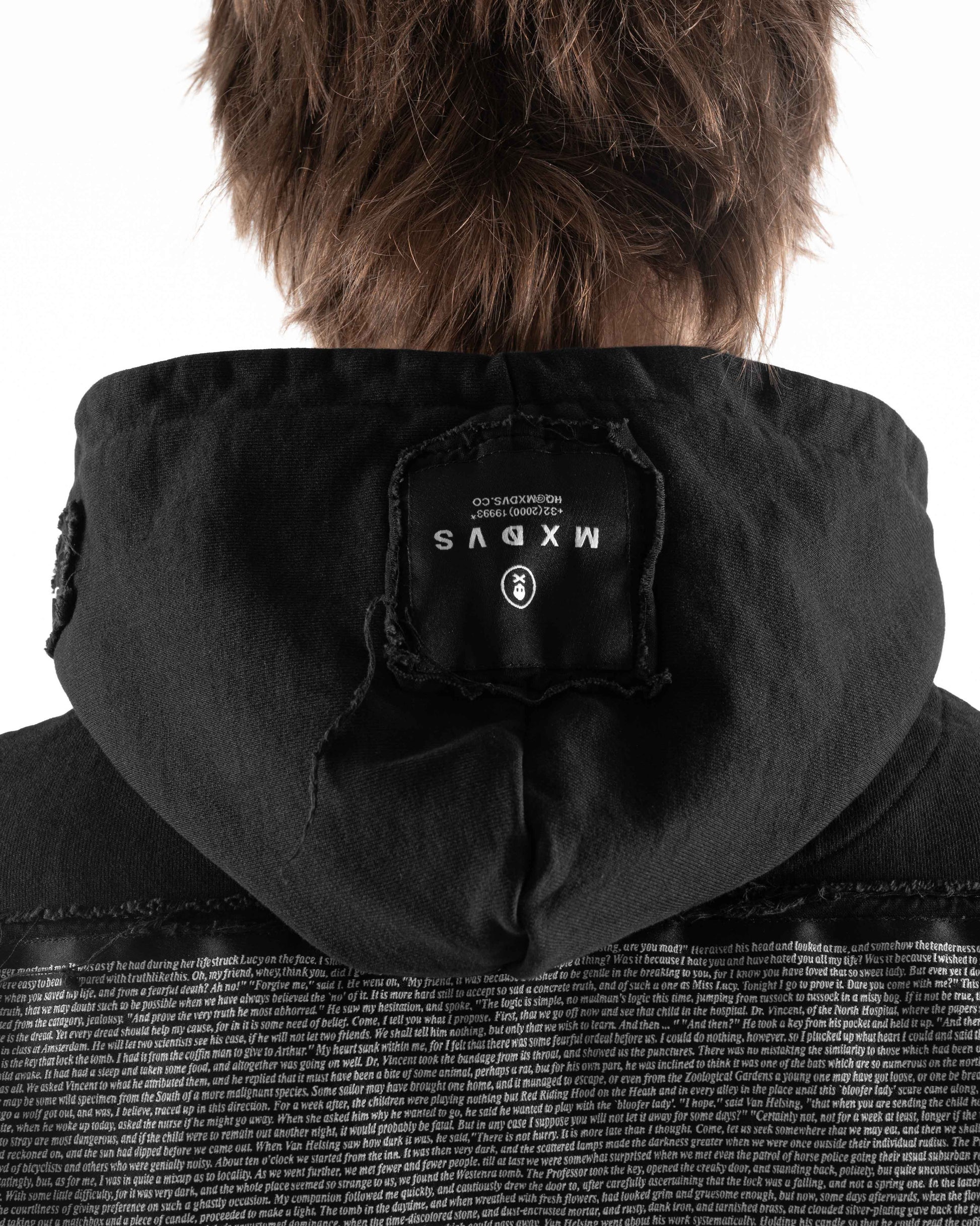 Unearthed from the silence of the grave. This piece is a monument to persistence, even in the face of death. It is adorned with 13 woven patches, including the entire 15th chapter of Bram Stoker's Dracula, a grayscale riot mask, and a timeline of medieval weapons.