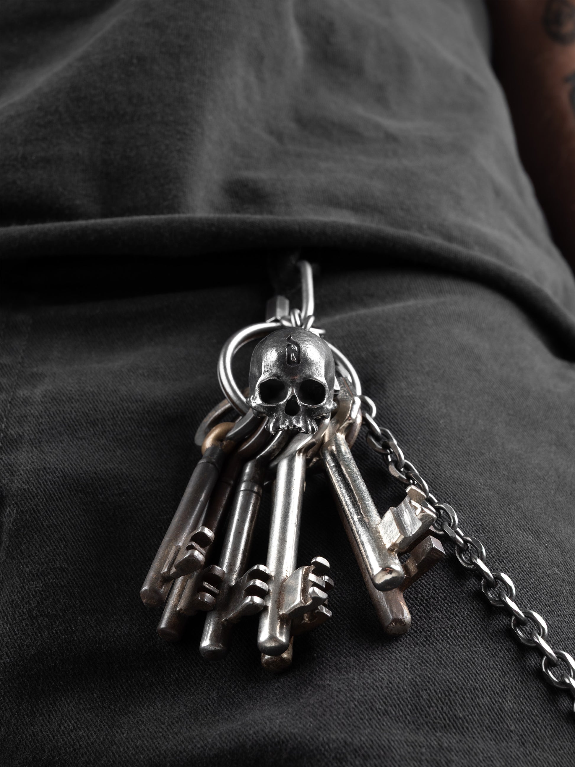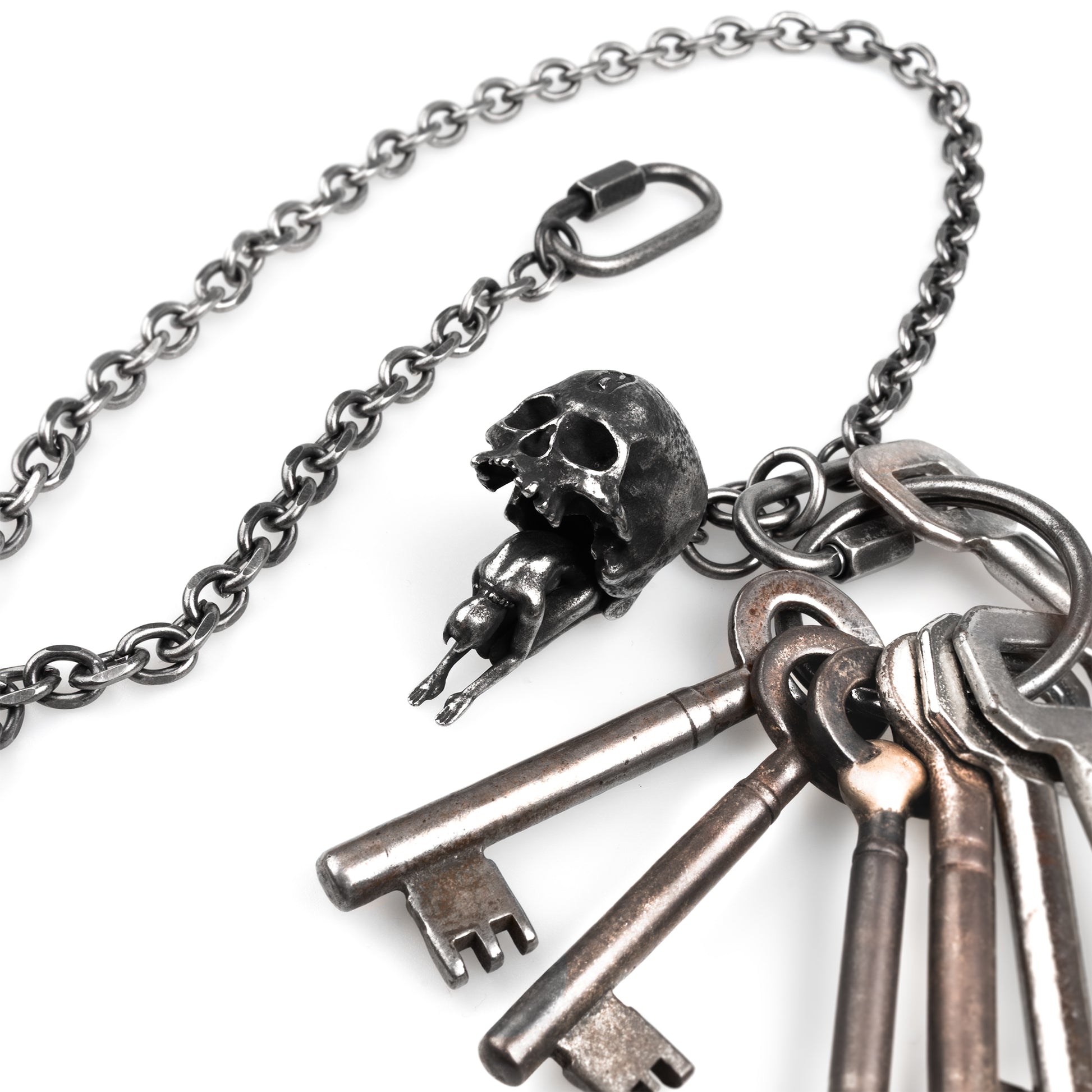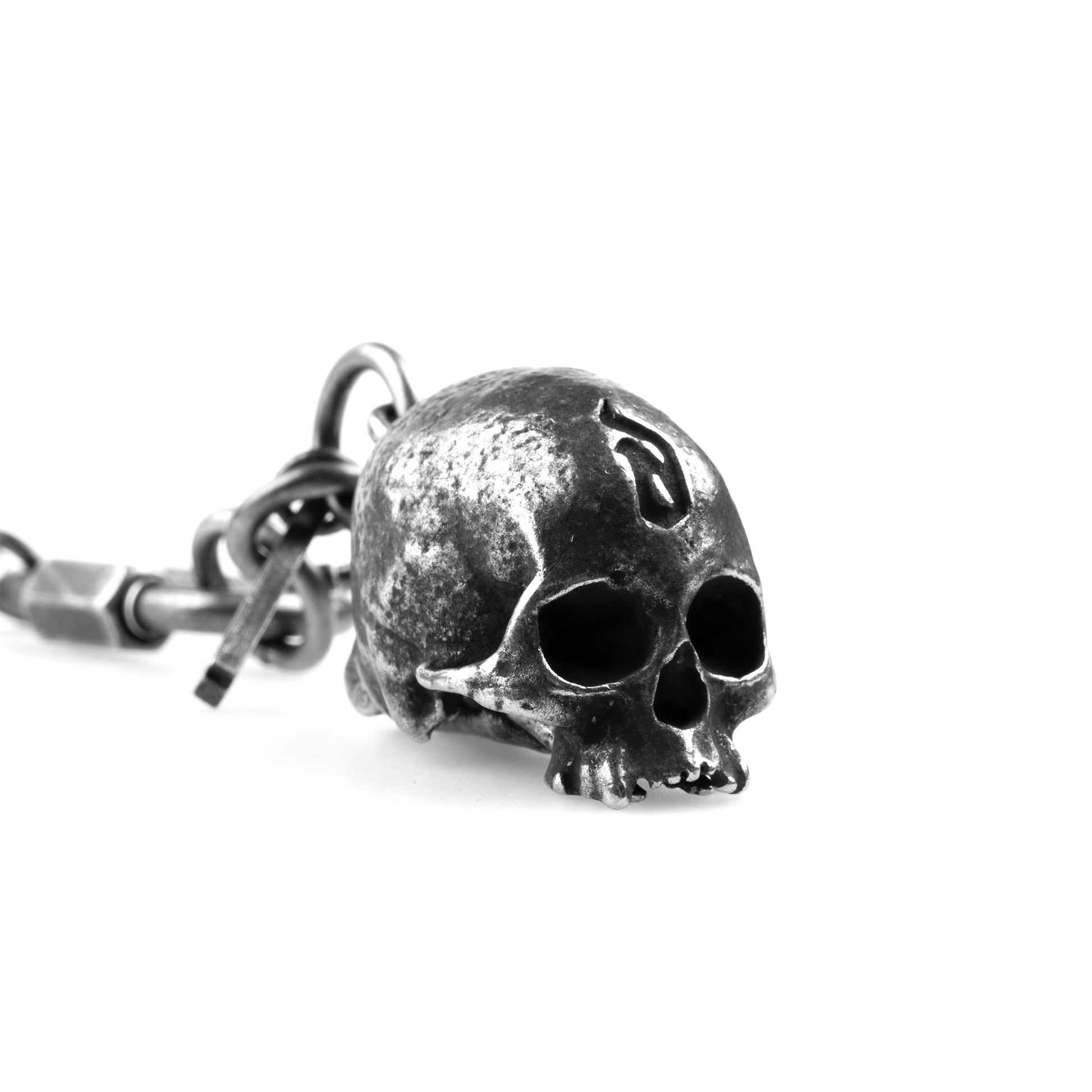A skull, the symbol of mortality, opens to show a woman in meditation with her head down and eyes shut. Humanity has long knelt in contemplation, forever suspended between hope and dread.
