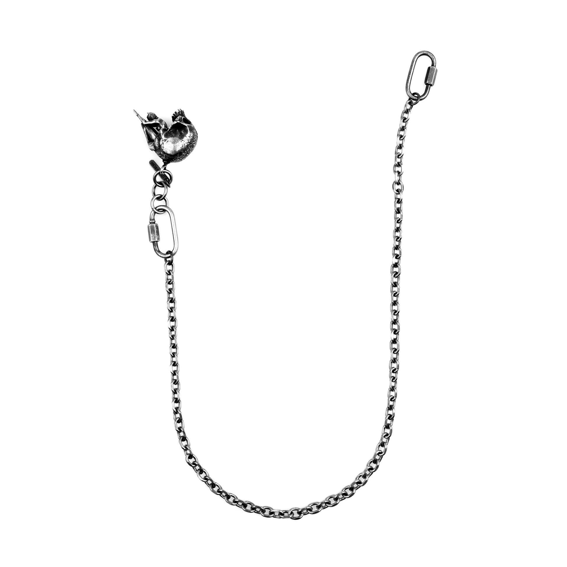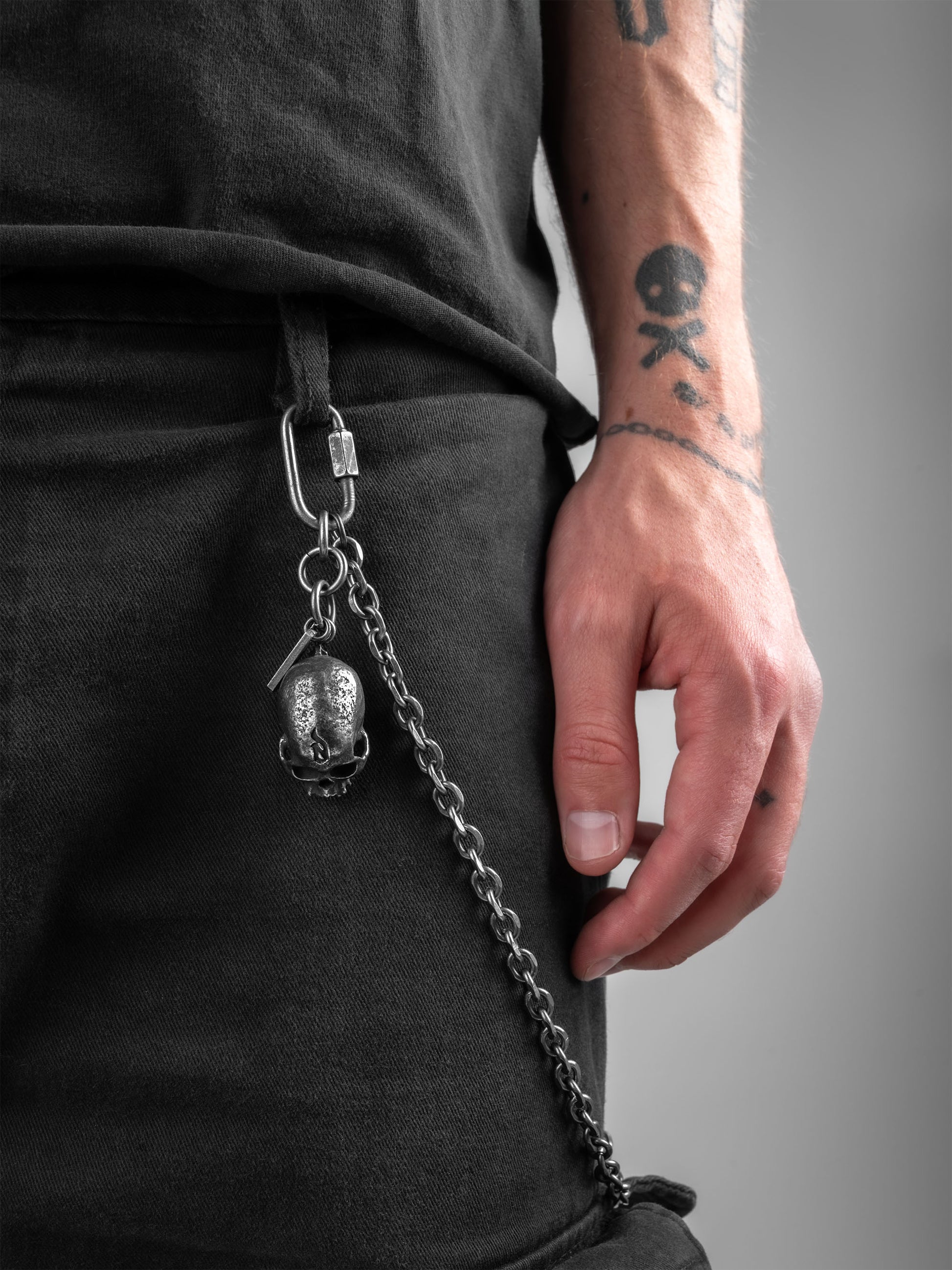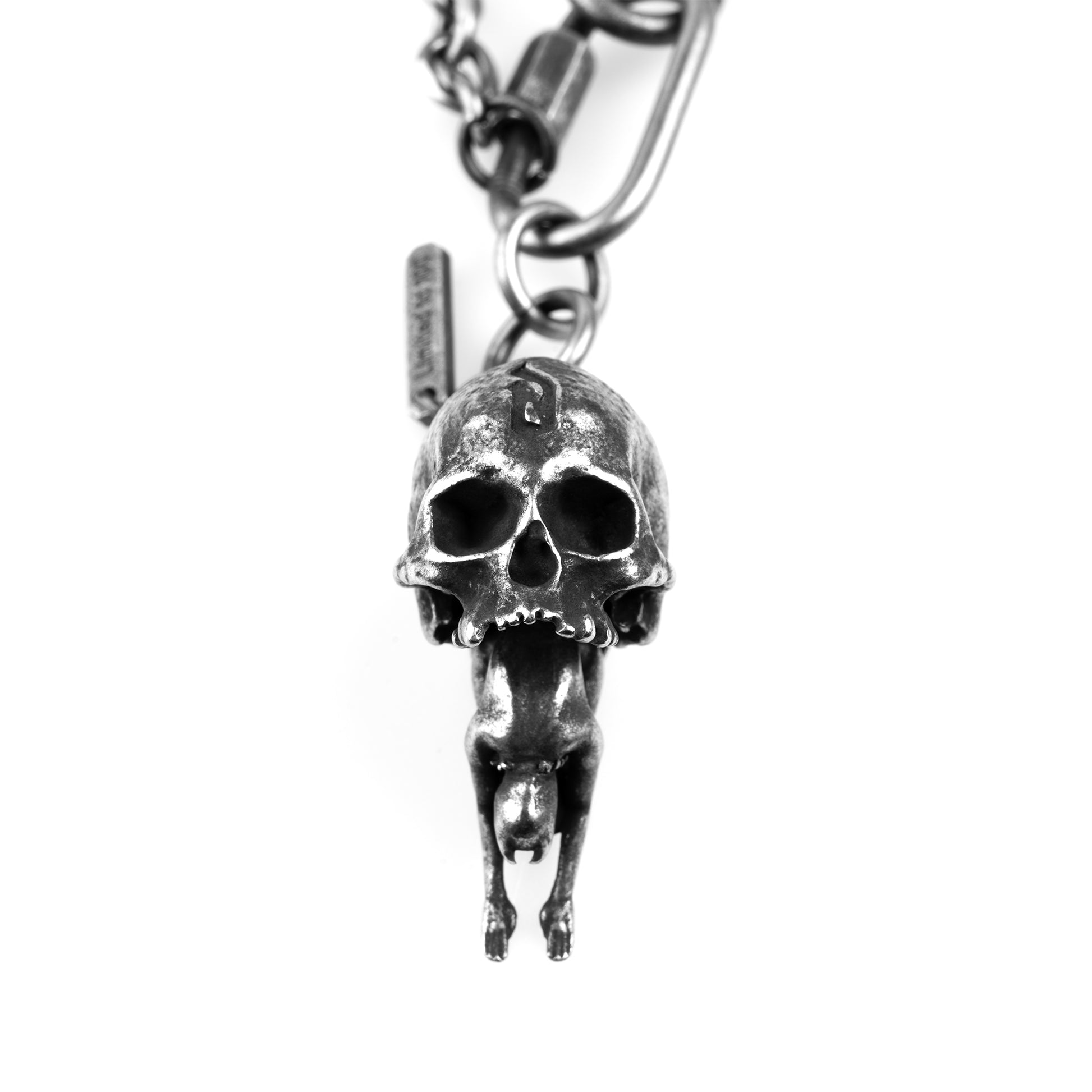 A skull, the symbol of mortality, opens to show a woman in meditation with her head down and eyes shut. Humanity has long knelt in contemplation, forever suspended between hope and dread.