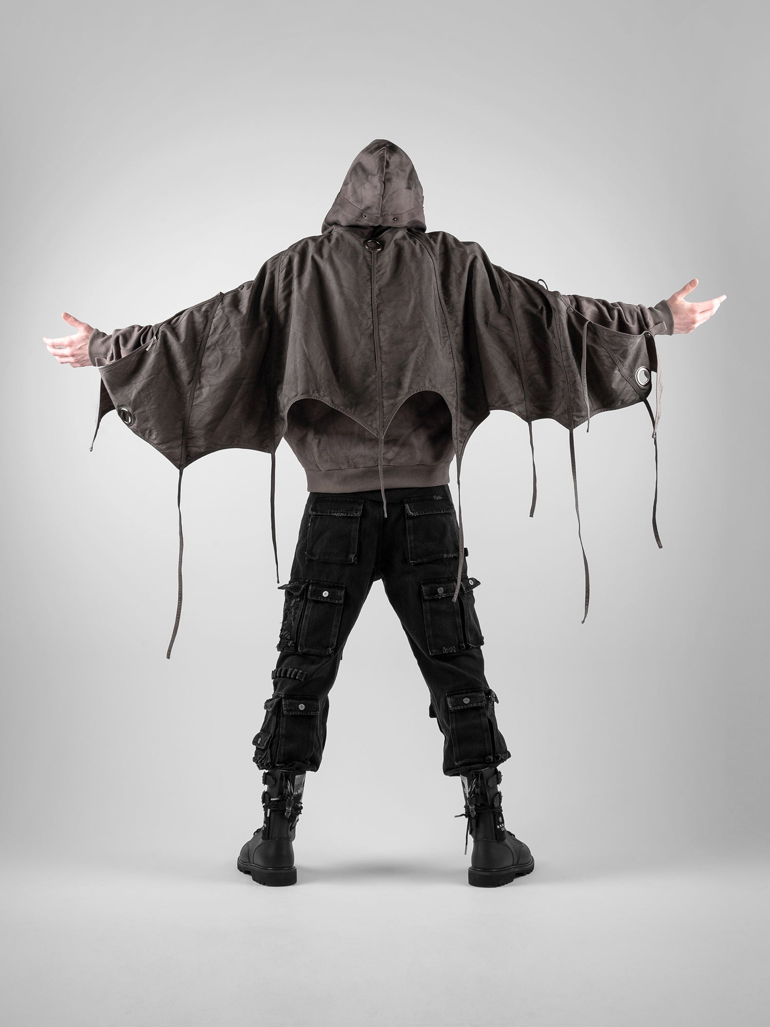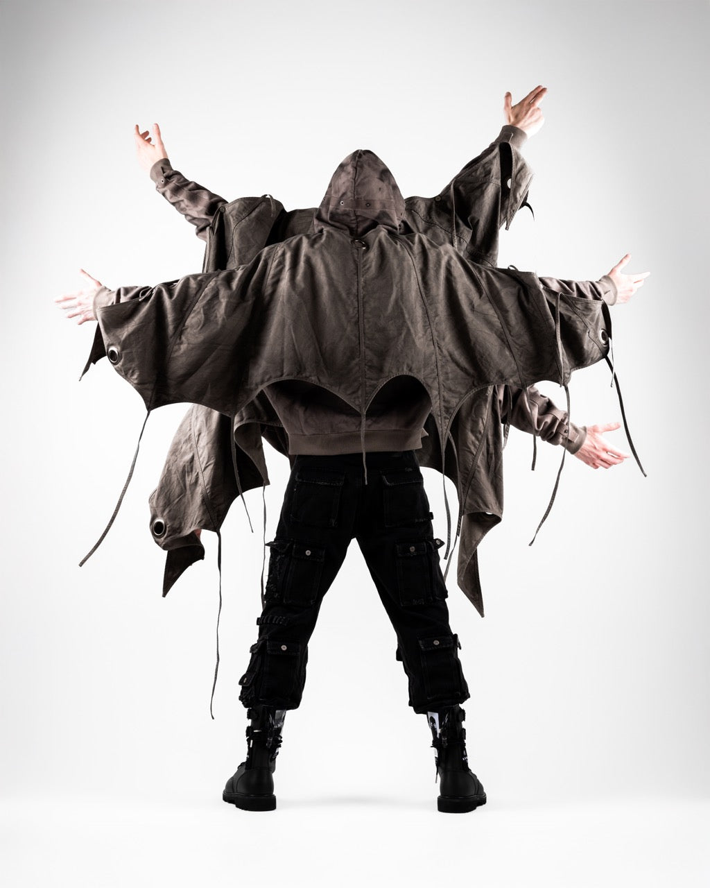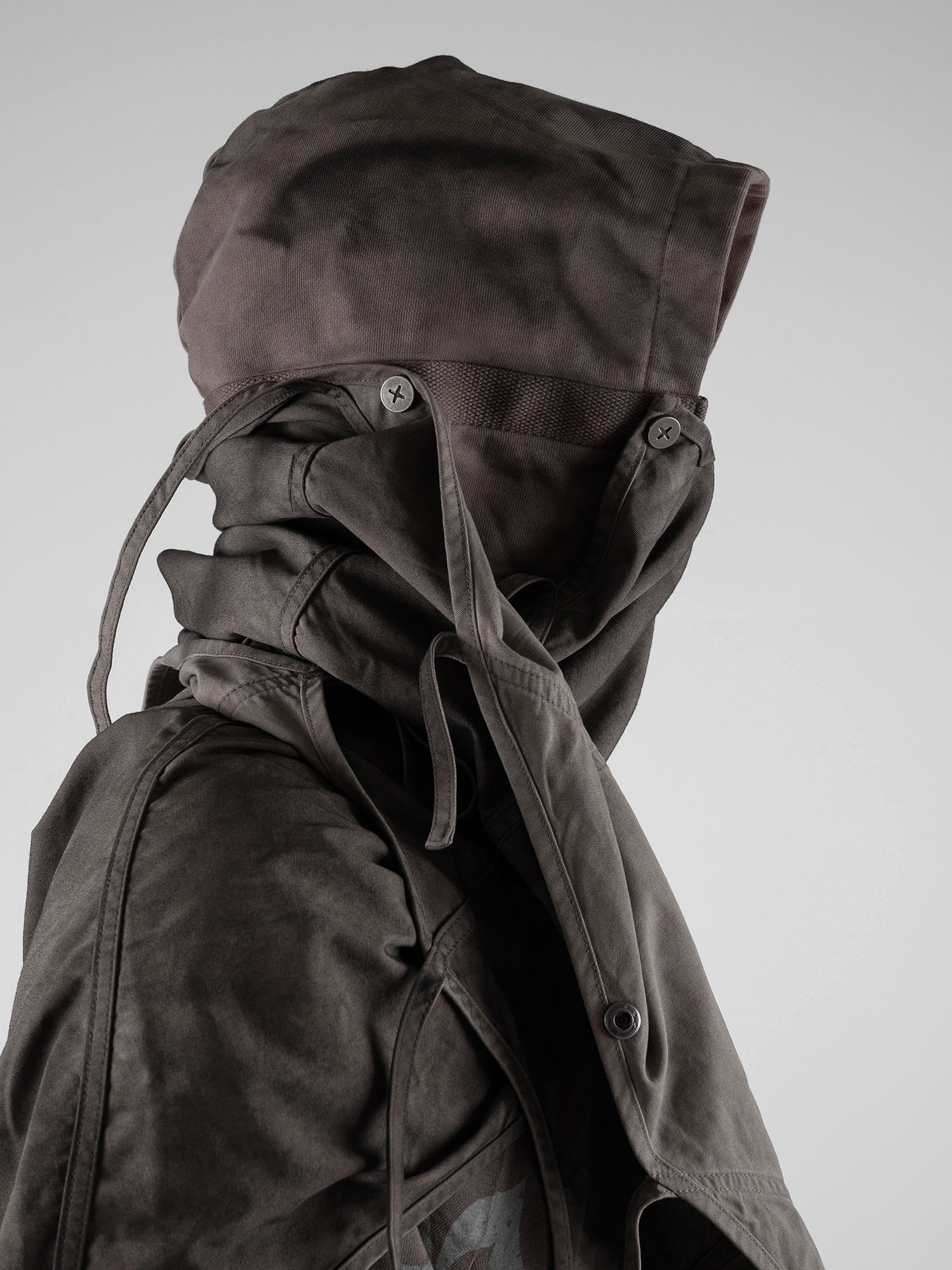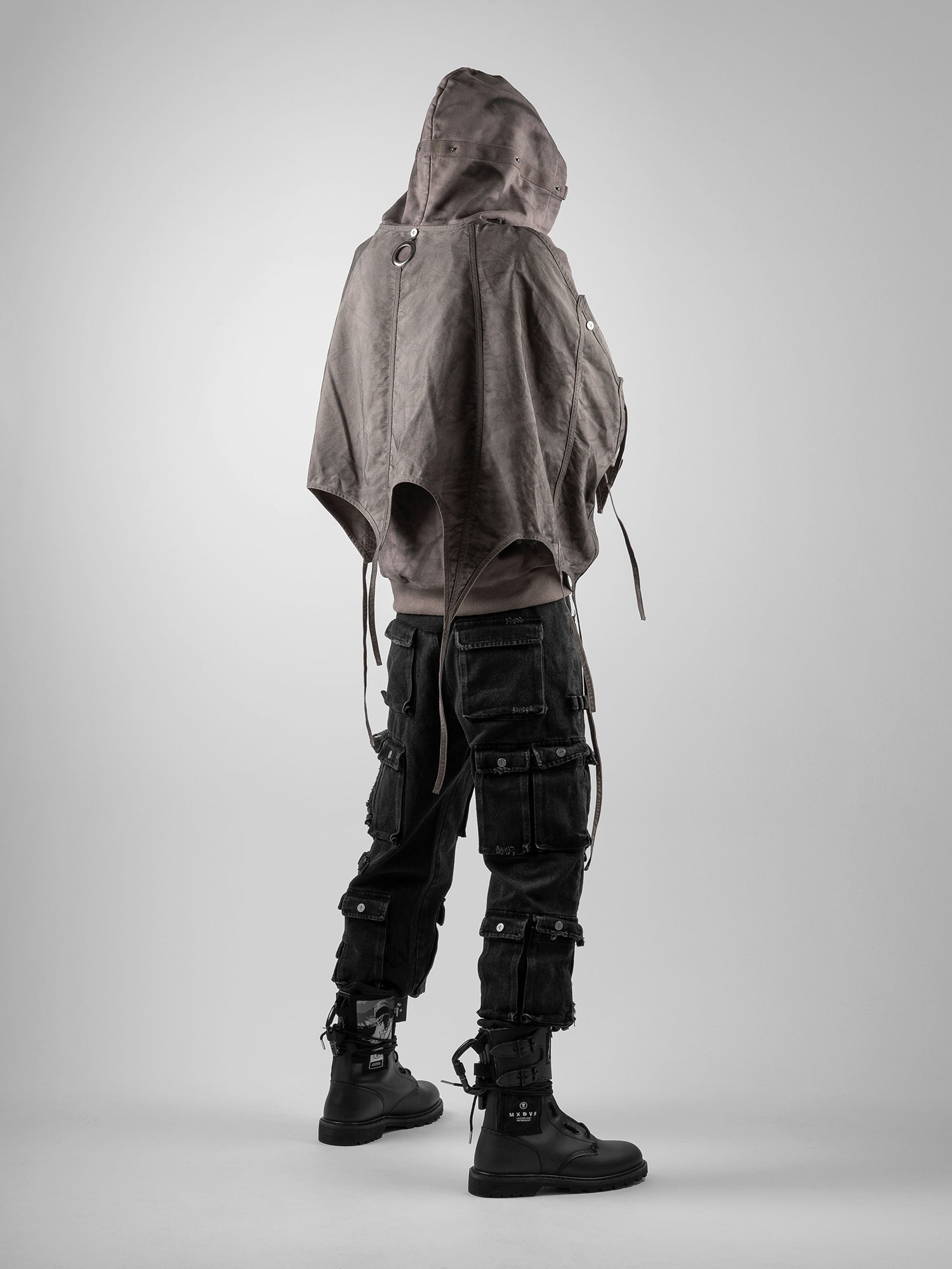 This piece is defined by a detachable cloak that transforms the silhouette. The draped fabric can detach from the sleeves and connect to the hood, partially concealing the face. This enables the garment to transition between retracted and deployed configurations, making it inherently multi-purpose.