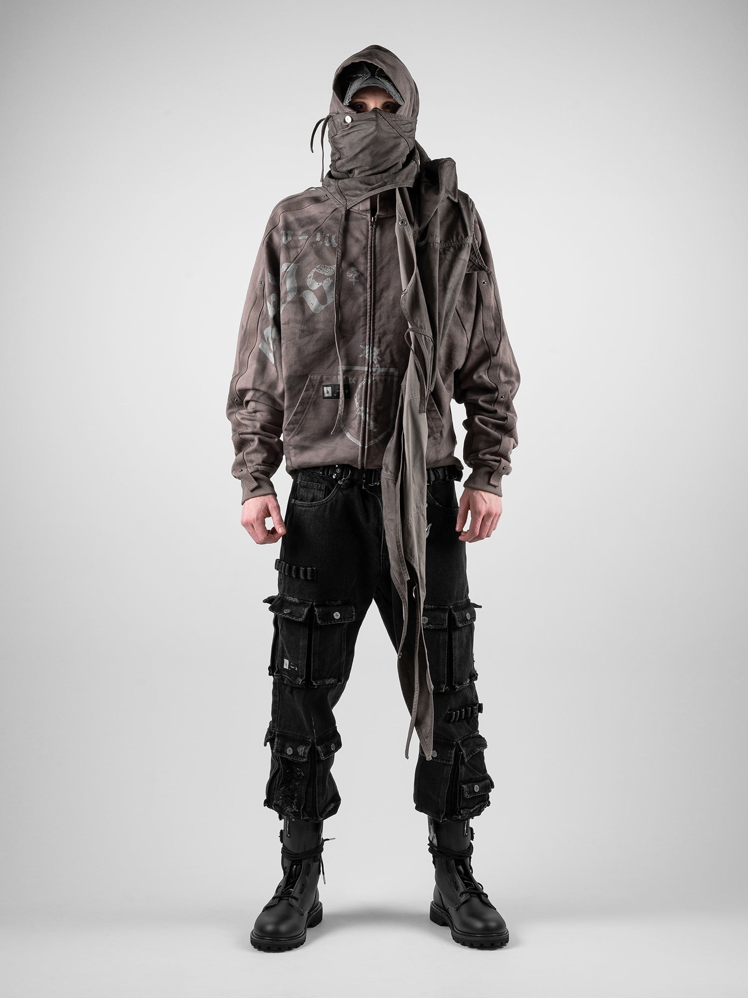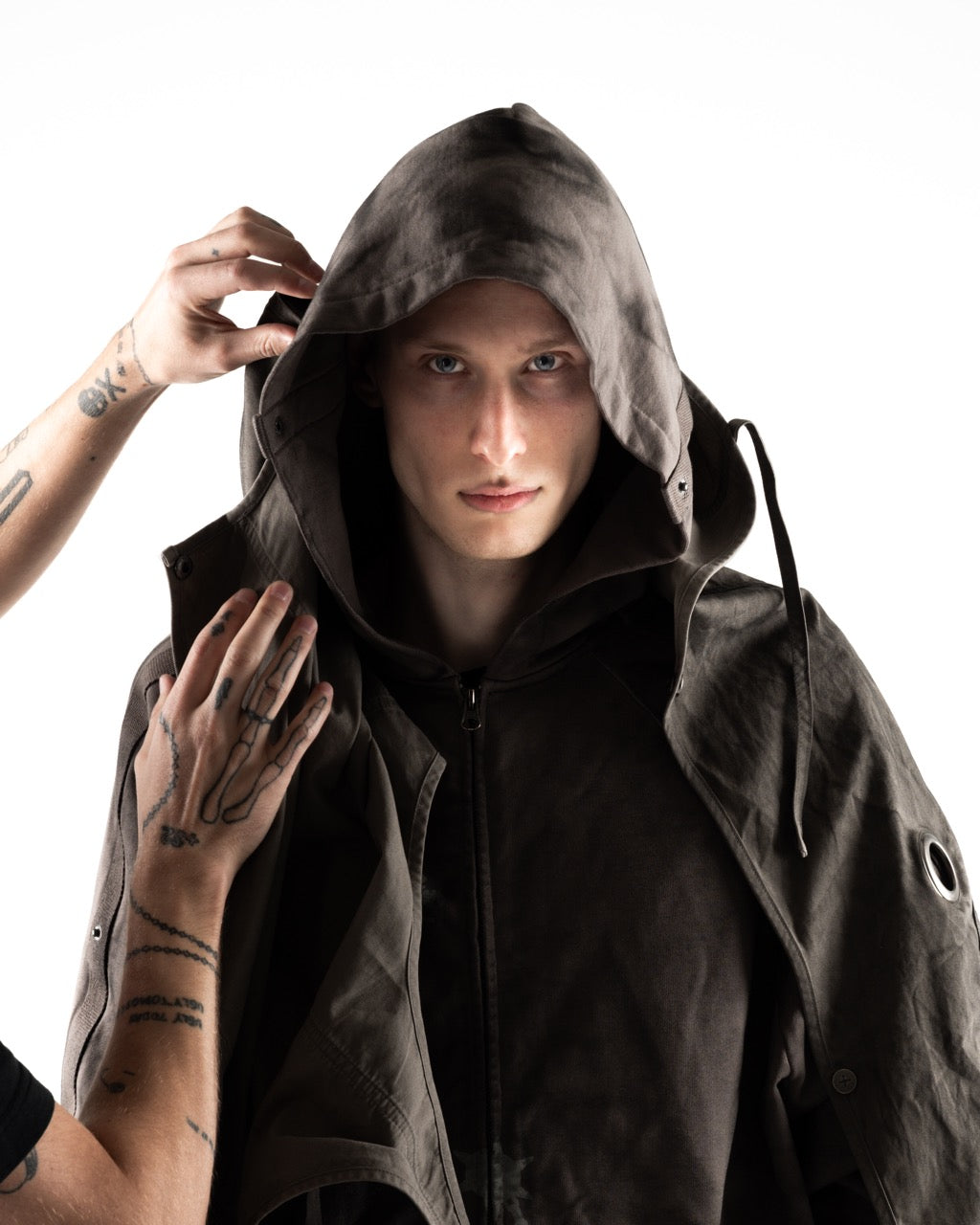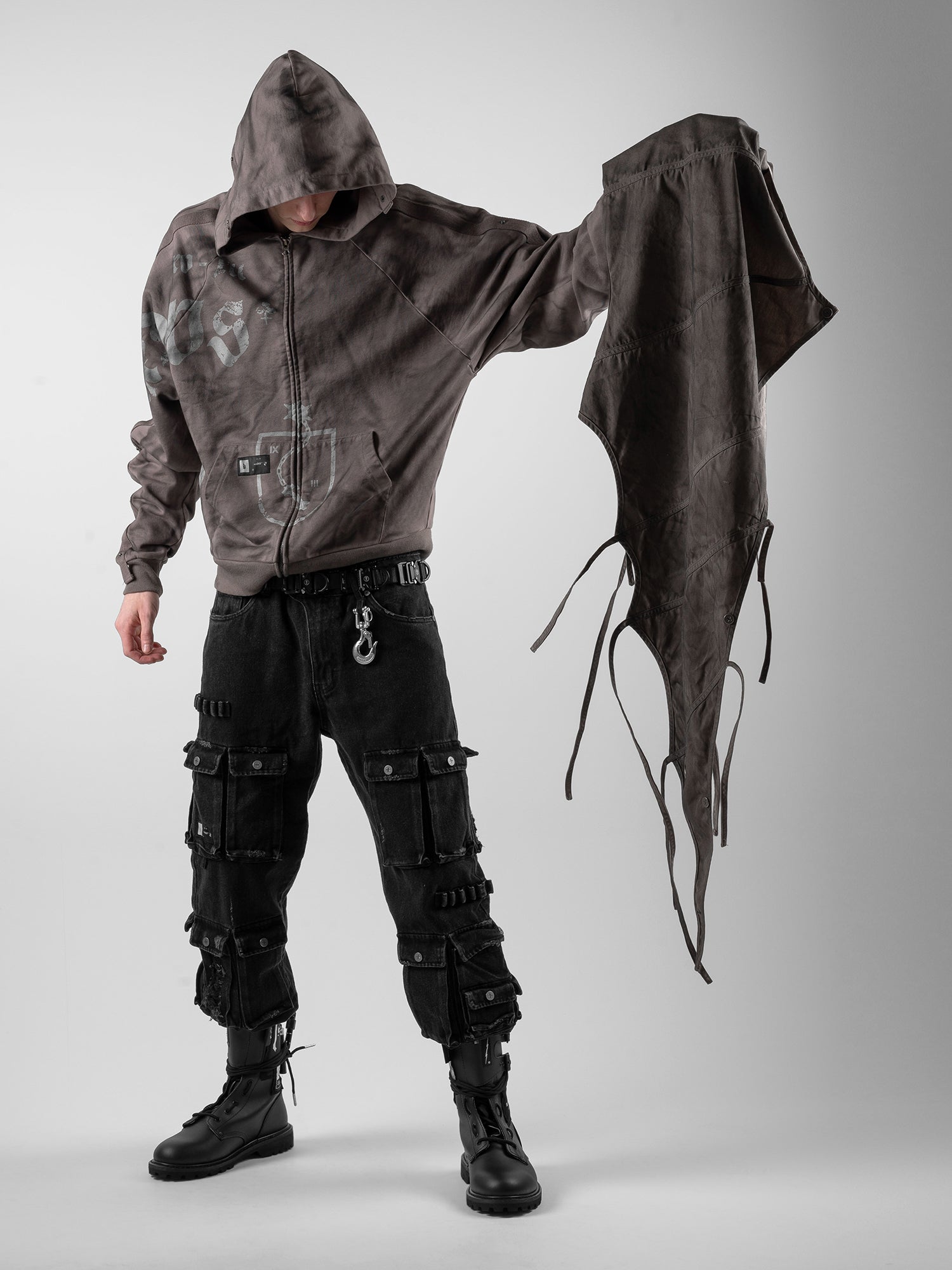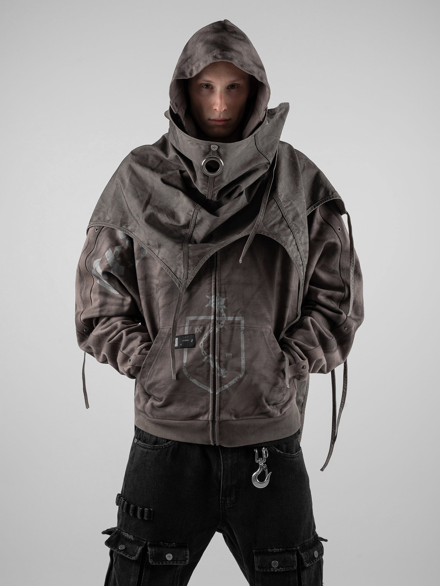 This piece is defined by a detachable cloak that transforms the silhouette. The draped fabric can detach from the sleeves and connect to the hood, partially concealing the face. This enables the garment to transition between retracted and deployed configurations, making it inherently multi-purpose.