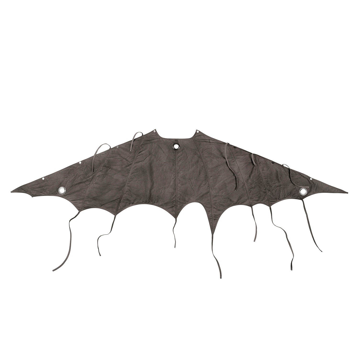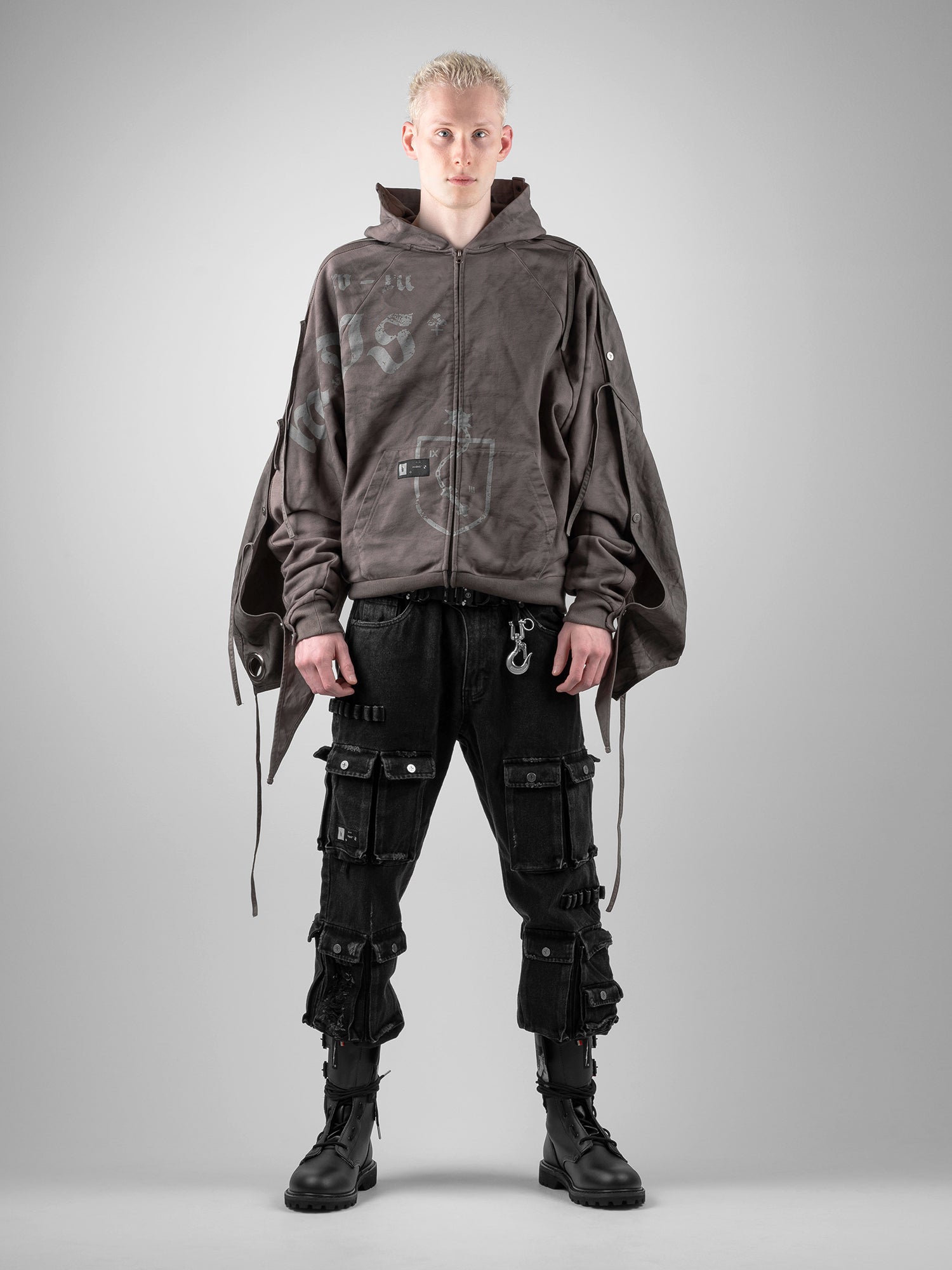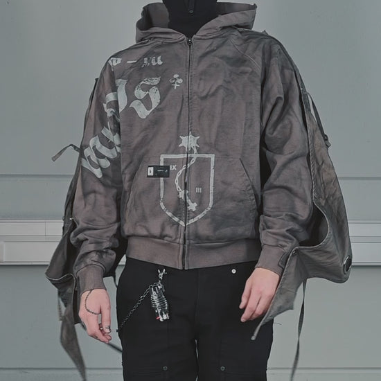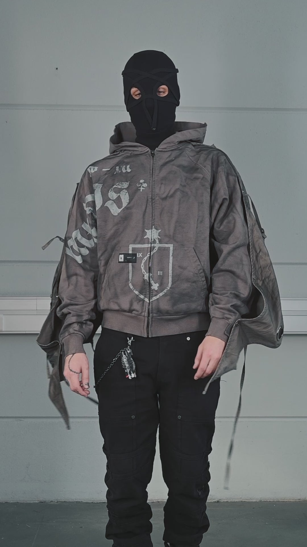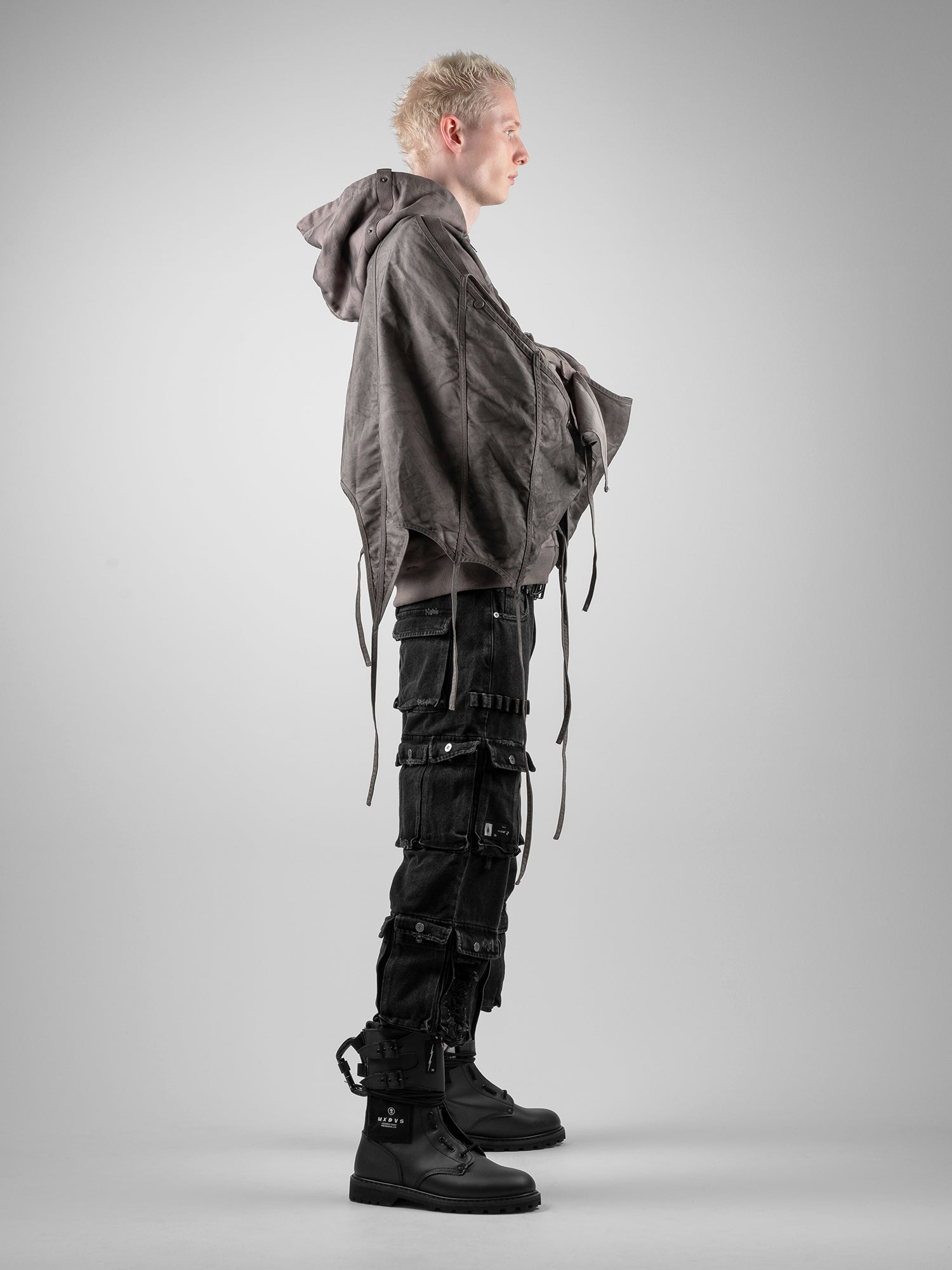 This piece is defined by a detachable cloak that transforms the silhouette. The draped fabric can detach from the sleeves and connect to the hood, partially concealing the face. This enables the garment to transition between retracted and deployed configurations, making it inherently multi-purpose.